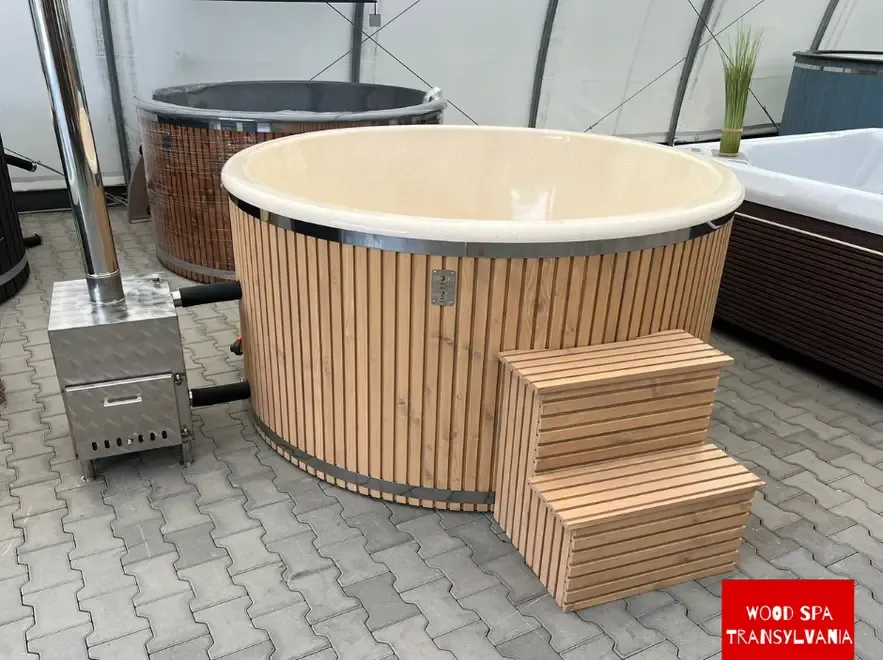 Dimensiuni 168 cm 105 cm inaltime Capacitate 4-6 persoane Lambriu pin nordic 12 5mm Calitate A Tratament dublu cu ulei de lemn Interior plastic PP 6 mm Soba exterioara rezistenta acid 22 kw 2 m Cos de fum inoxidabil Timp de incalzire 2-3 ore Bancuta interior plastic Scara exterioara cu 3 trepte Capac prelata culoare Bej Culoare exterior la alegere Nuc Stejar Auriu Cires sau Antracit Optional Capac izolat grosimea 10 cm 1 375 RON TVA inclus Transport - pret in functie de locatie