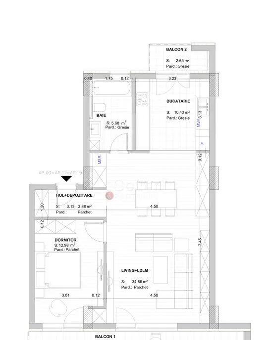 - Bucataria, de tip open space, cu acces catre cel de al doilea balcon;
