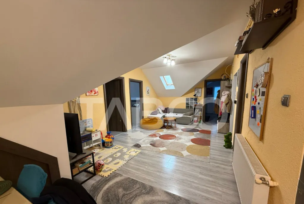 TABOO Imobiliare propune un apartament de vanzare cu 4 camere, semidecomandat, situat in localitatea Sibiu, zona Tilisca, aflat la Mansarda intr-un imobil tip bloc cu regim de inaltime pe Parter + 4 Etaje + Mansarda; anul constructiei 2008, structura caramida. Suprafata utila de 72 mp + balcon de 5 mp.