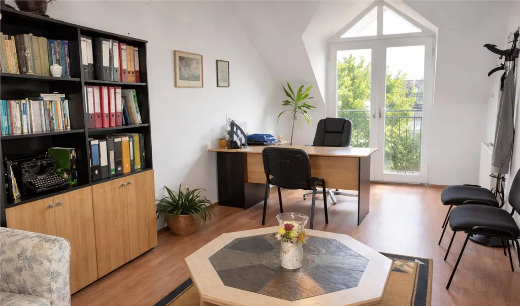 Mansarda ofera un birou generos de 28,1 mp si o bucatarie de 10,2 mp.