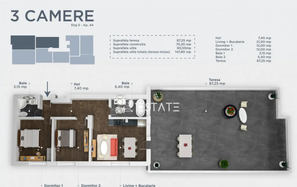 Va prezentam pentru vanzare un apartament de 3 camere cu terasa de 87 mp, situat la etajul 5, intr-un ansamblu rezidential foarte atractiv si bine planificat, oferind o gama variata de locuinte pentru diferite nevoi si preferinte.