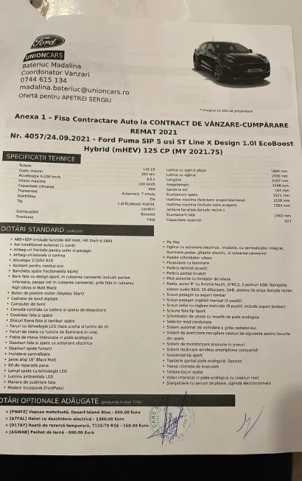 TELEFON O729 766 515 TELEFON O729 766 515 SERIE SASIU WF02XXERK2LL66665 Ford Puma Auto in garantie pana pe 01 10 2027 Hybrid parcare gratuita in Bucuresti Unic Proprietar Auto achizitionat de nou Rulaj 45000 Km Motorizare 1 0 Hybrid 6 Trepte 125 Cp Norma de poluare Euro 6 Inmatriculat pe 19 11 2020 Consum urban 5 Litri 100 Km Consum extraurban 4 Litri 100 Km Revizii efectuate la Reprezentata Ford Climatronic Navigatie Apple carplay Android auto Comenzi vocale Sistem Start stop cu buton de decuplare Functia My Key Conectivitate telefon bluetooth pt apeluri tel muzica YouTube Spotify Etc Geamuri electrice fata spate Sistem multimedia cu tableta 6 inci cu touch screen Aplicatie FORDPASS control de pe telefon inchidere deschidere localizarea masinii si alte functii Computer de bord Volan in piele schimbator in piele Comenzi audio pe volan Pilot automat Oglinzi electrice rabatabile electric Volan reglabil Inchidere centralizata Lumini...