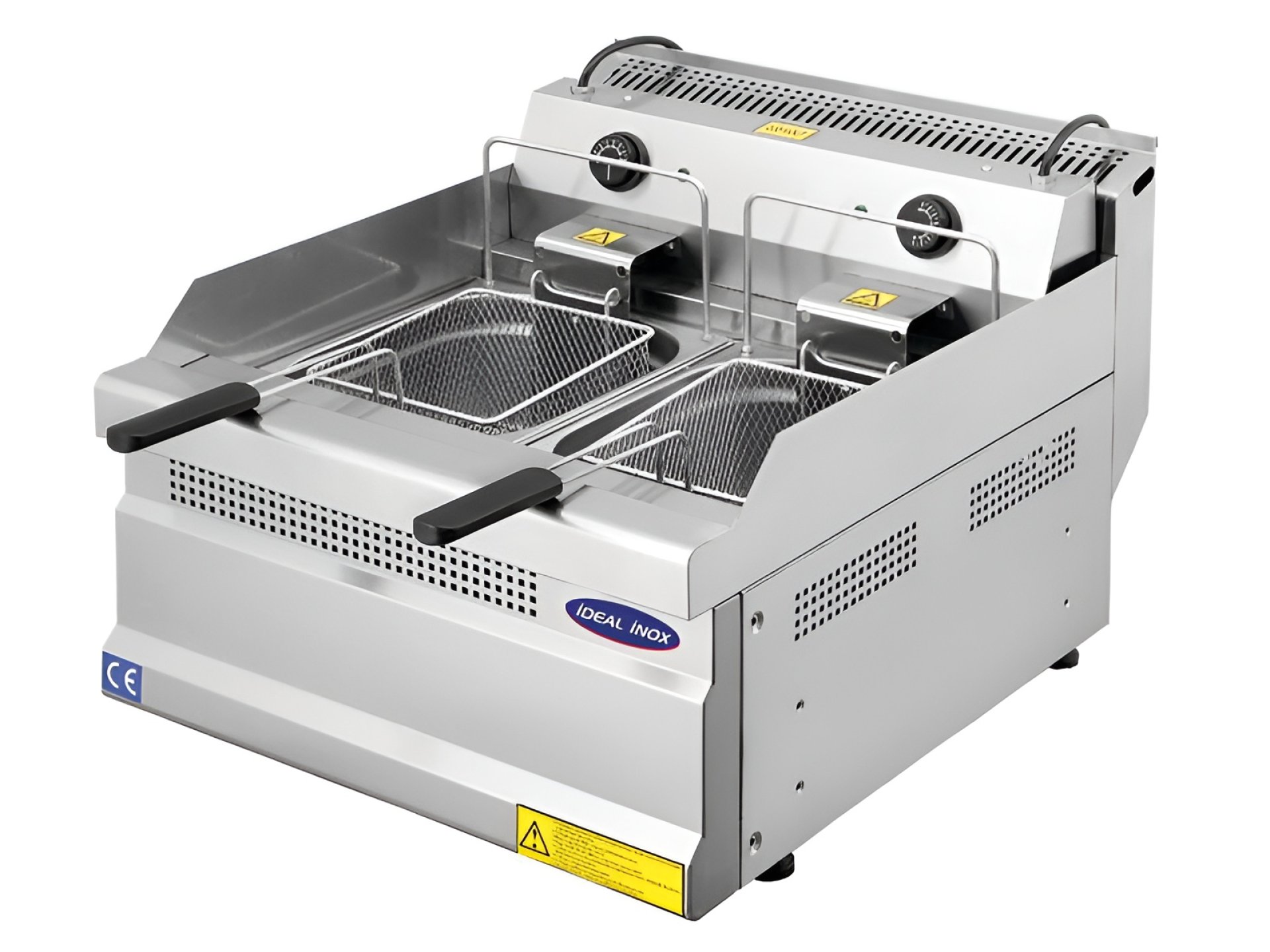 Friteuza de banc electrica dubla, constructie inox, vas ulei din inox. Fiecare cuva functioneaza independent. Temperatura friteuzei este controlata de un termostat ajustabil 100-200 °C. Indicator luminos pentru functionarea elementului de incalzire. Picioare reglabile pe inaltime. Include 2 cosuri de prajire cu manere lungi, izolate.