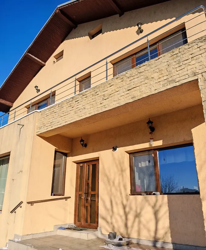 Ofer spre vanzare casa P+1E, cu 5 incaperi, bucatarie si 2 grupuri sanitare, camerele de la etajul 3 dispun de balcoane, iar livingul de la parter este foarte generos ca spatiu. Bucataria este realizata pe comanda, iar grupurile sanitare sunt ample, cel de la parter fiind dotat cu dus si cada. Casa beneficiaza si de un pod spatios si curat, ideal pentru depozitare. Exista posibilitatea vanzarii cu mobilier inclus sau unele incaperi pot fi evacuate. Beneficiaza de izolatie termica de 10 cm. Detine centrala proprie, racordare la apa si energie electrica. Suprafata desfasurata este de 198 mp, cu o amprenta la sol de 100 mp, amplasata pe un teren de 420 mp. In curte se afla si o magazie de 16 mp, prevazuta cu beci.