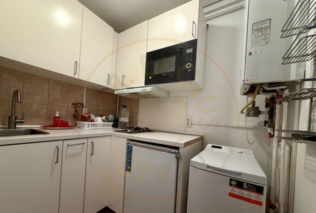 Prima inchiriere garsoniera nou renovata si dotata zona ultracentrala Piata Universitatii vedere exceptionala spre Calea Victoriei cu acces la business-uri restaurante si cafenele Intrarea in imobil este prin Strada Edgar Quinet vis-a-vis de Casa Capsa iar vederea este spre Palatul Centrului Militar National Tot mobilierul este nou realizat pe comanda si completat cu piese Ikea Canapeaua este extensibila si ofera spatiu de dormit comod pentru doua persoane Bucataria este utilata cu masina de spalat rufe plita inductie impreuna cu hota extractoare combina frigorifica si cuptor electric combinat cu microunde Toate aparatele sunt noi si impreuna cu iluminatul integral LED asigura eficienta energetica maxima Blocul beneficiaza de centrala proprie si se afla la cateva minute distanta de metrou si statii de autobuz/troleibuz