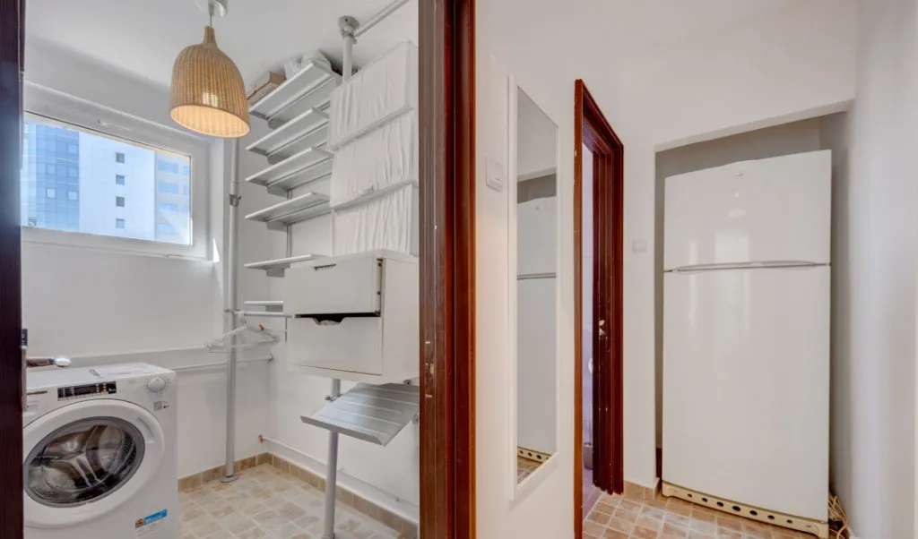 Din holul de la intrare, spre stânga, este camera garsonierei care are 21,5mp la care se adaugă și balconul de 3mp (inclus în suprafața utilă), cu ferestre mari spre curtea din spate. În față este o debara în care este situată și mașina de spălat, iar lângă ea este baia cu cadă și aerisire directă.