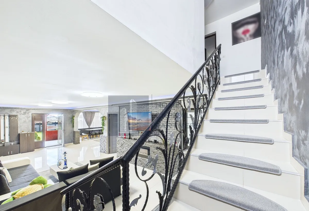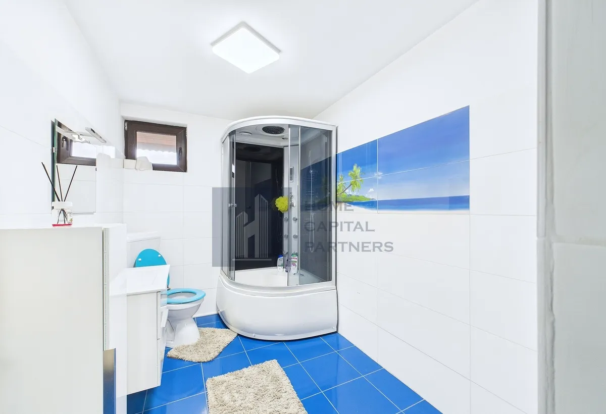 Parterul este dedicat zonei de zi: living cu lumina naturala si iesire catre terasa de la parter, loc optim pentru masa in aer liber. Bucataria este separata, cu spatiu functional, iar baia de serviciu deserveste zona de zi. Etajul reuneste 4 dormitoare, configurate pentru odihna si intimitate, o baie si un balcon ce completeaza confortul nivelului superior.