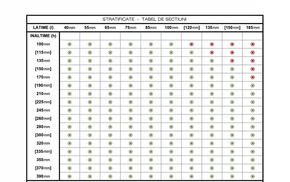 Sectiunile pastrate in stoc sunt 100 x 100mm 100 x 115mm 115 x 1115mm Pentru sectiunile mici si medii pretul de fabrica este intre 490Euro si 580Euro pe metrul cub Doar pentru sectiunile foarte mari de 25 x 25cm acesta poate atinge maxim 750Euro pe metrul cub