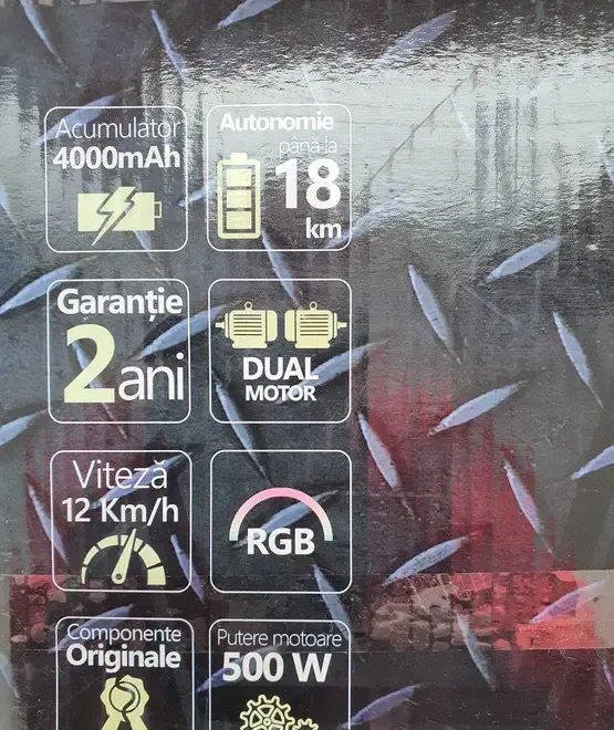 Numar motoare - 2<br /> Putere motor - 500 W<br /> Viteza maxima - 12 km h<br /> Diametru roata - 6 5 inch<br /> Greutate maxima suportata - 60 Kg<br /> Unghi de urcare in siguranta - 20<br /> Tip acumulator - Lithium-Ion<br /> Capacitate acumulator - 4 Ah<br /> Autonomie acumulator - 18 km<br /> Voltaj baterie - 42 V
