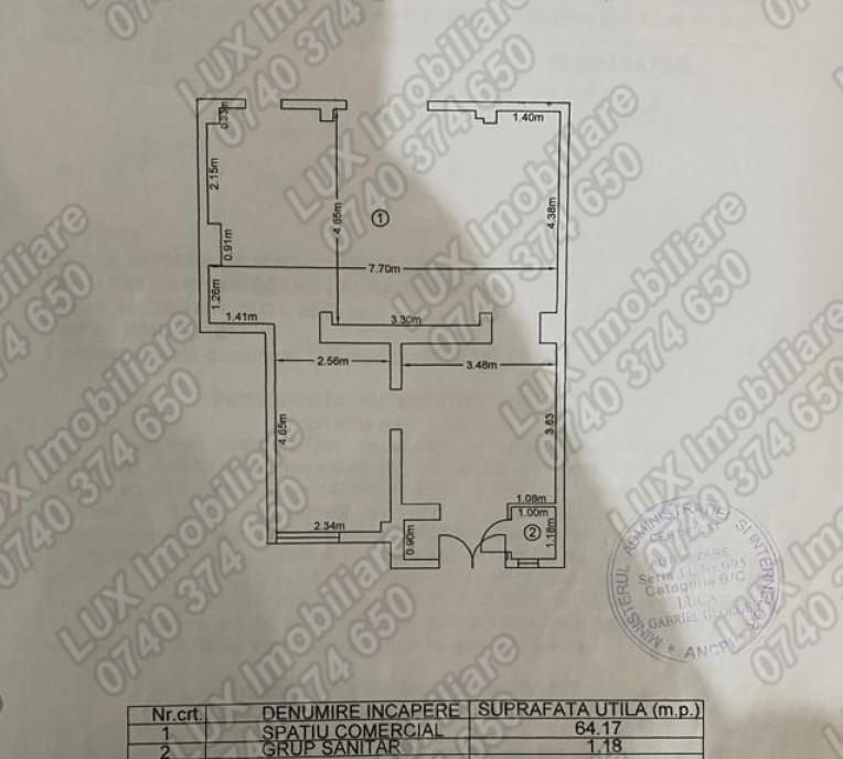 Agentia Lux Imobiliare va ofera spre vanzare spatiu comercial situat pe strada 1848 Datorita amplasarii pe o strada circulata atat pietonal cat si auto spatiul este pretabil pentru diverse activitati salon infrumusetare spatiu birouri cabinet medical etc - Imobilul are o suprafata de 36 mp - Imobilul dispune de toate utilitatile necesare - apa curent si canalizare - Compartimentare Sala de asteptare camera 2 grupuri sanitare si balcon inchis - Dispune de aparat de aer conditionat PRET 60 000 Euro Detalii suplimentare la numerele de telefon 0740 374 650 Marin Nicolae 0744 814 740 Alina 0756 557 146 Ioana E-mail email 160 protected www agentialuximobiliare ro Facebook Agentia Lux / Lux Imobiliare Ne gasiti pe INSTAGRAM YOU TUBE si pe TIK TOK