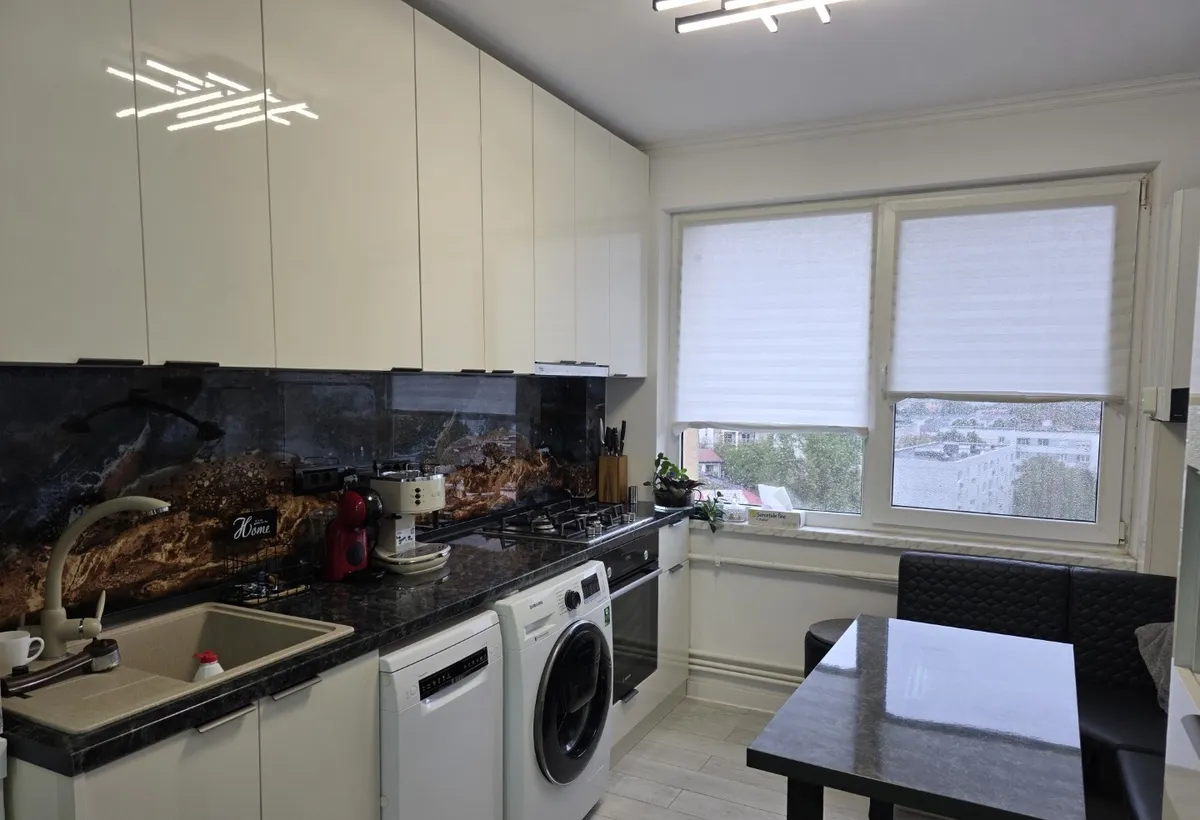 Bucataria are mobila din pal melaminat, cuptor, plita, frigider, cuptor cu micounde, masina spalat vase si masina spalat rufe, toate in stare foarte buna.