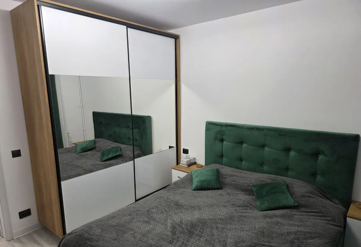 Dormitorul este complet, pat, dulap, noptiere, comoda si televizor.