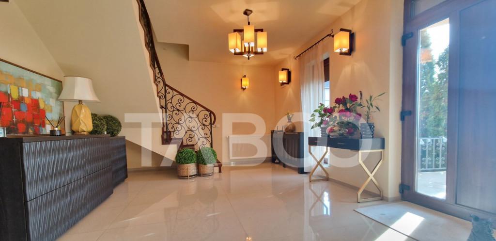 Va propunem spre vanzare casa superba cu 5 camere care pe langa toate facilitatile proprietatii ofera si o priveliste de vis fiind situata langa Padurea Dumbrava Aceasta proprietate impresionanta nbsp detine un teren de 463 mp iar casa icirc n sine are o suprafata utila de 172 mp oferind spatiu suficient pentru confortul tau si al celor dragi Construita icirc n 2018 aceasta vila moderna beneficiaza de o structura din caramida solida si este dotata cu un sistem de icirc ncalzire eficient incluz acirc nd centrala proprie si icirc ncalzire icirc n pardoseala alaturi de un sistem de climatizare pentru zilele calduroase Icirc mpartirea inteligenta a spatiului - Parter hol de acces living generos baie bucatarie bine echipata cu acces la camara o camera care poate fi birou si inca o camera tehnica precum si o terasa perfecta pentru momentele de relaxare - Etaj hol 3 dormitoare luminoase dintre care doua cu dressing propriu baie suplimentara si doua balco...