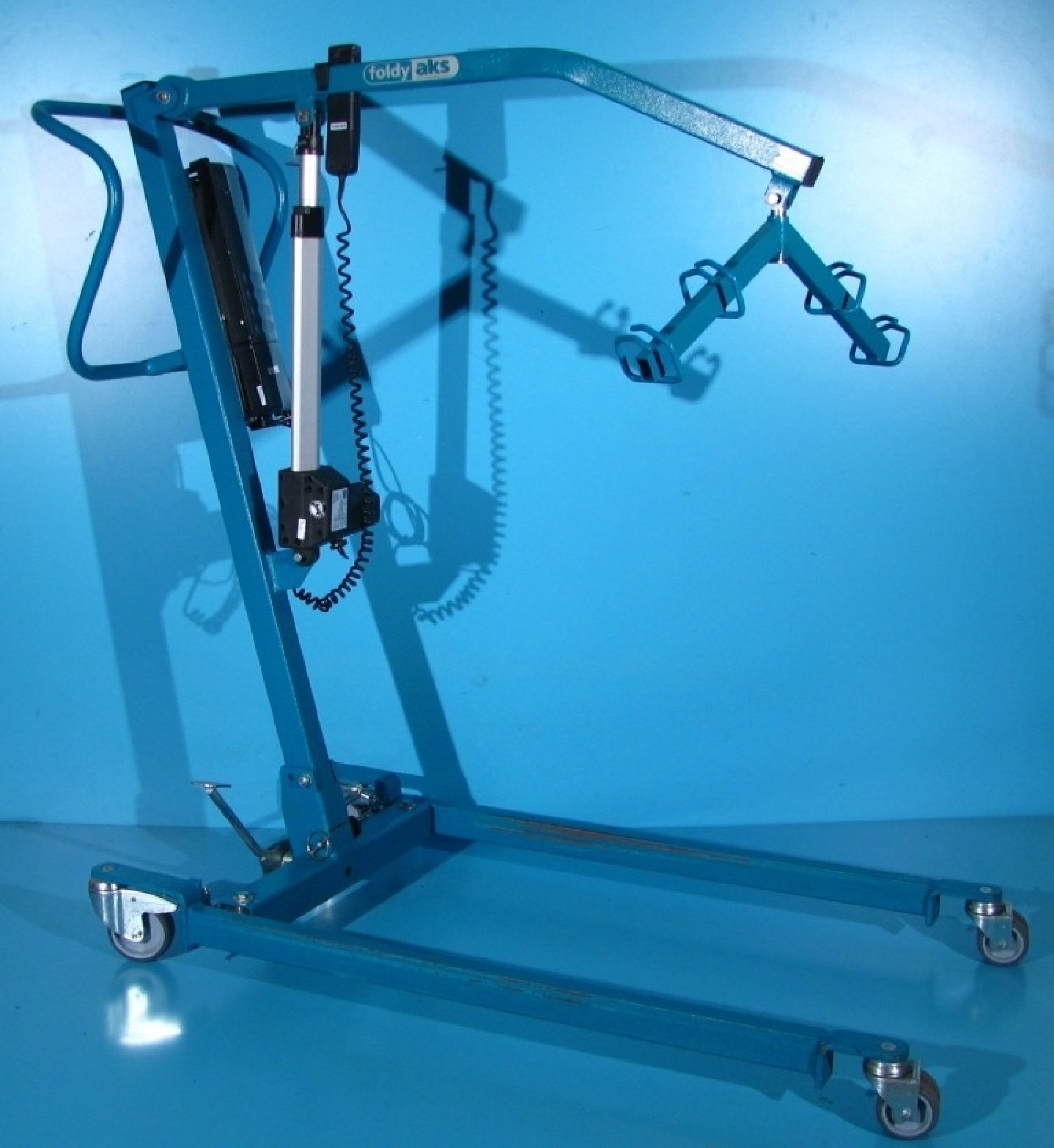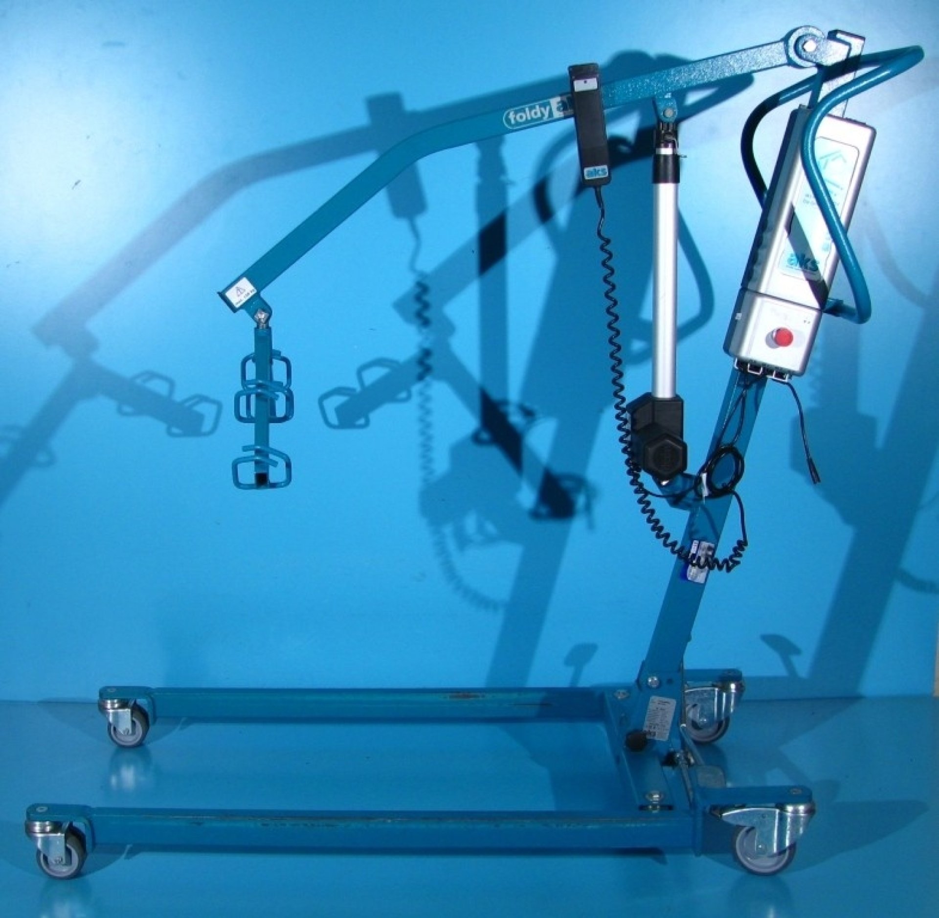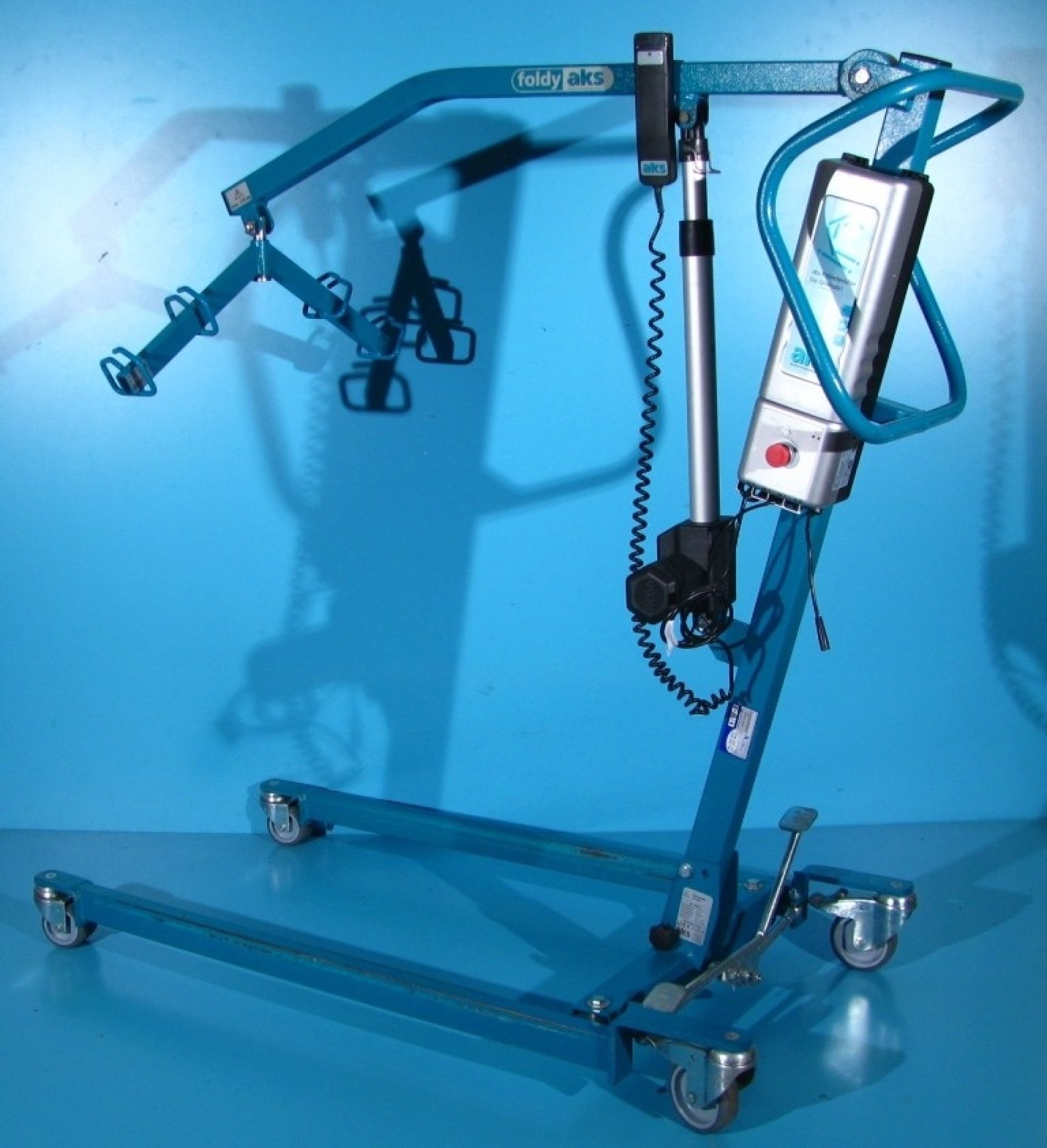Acest lift pentru pacienti se regleaza cu ajutorul unei manete si este dotat cu 4 roti din care cele 2 din spate sunt cu sistem de franare pentru picior.