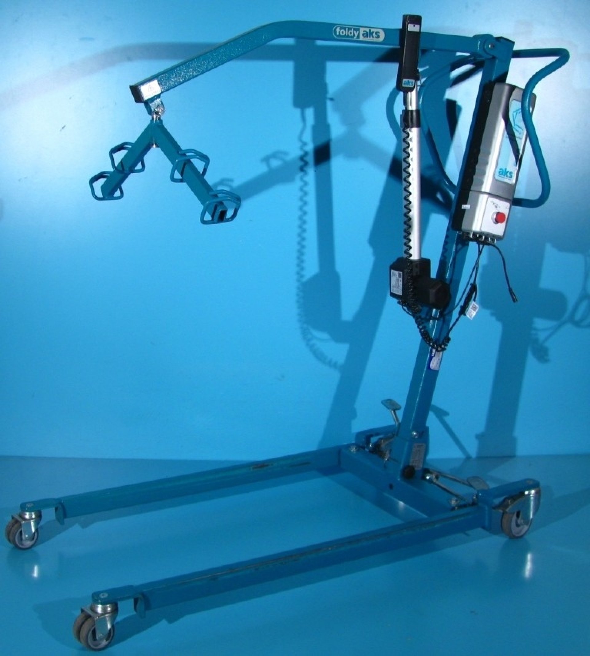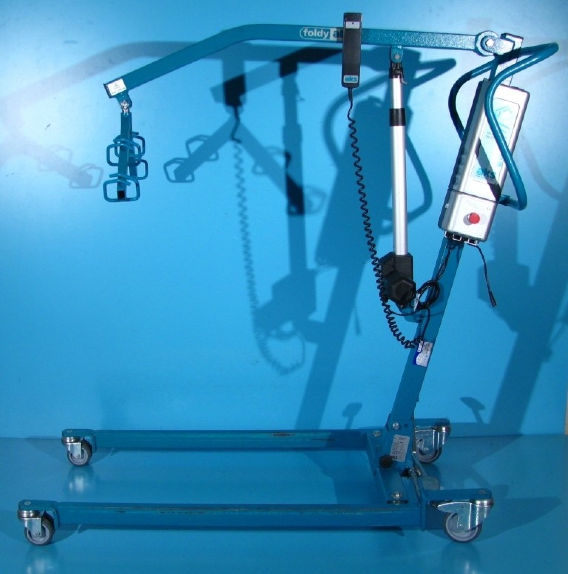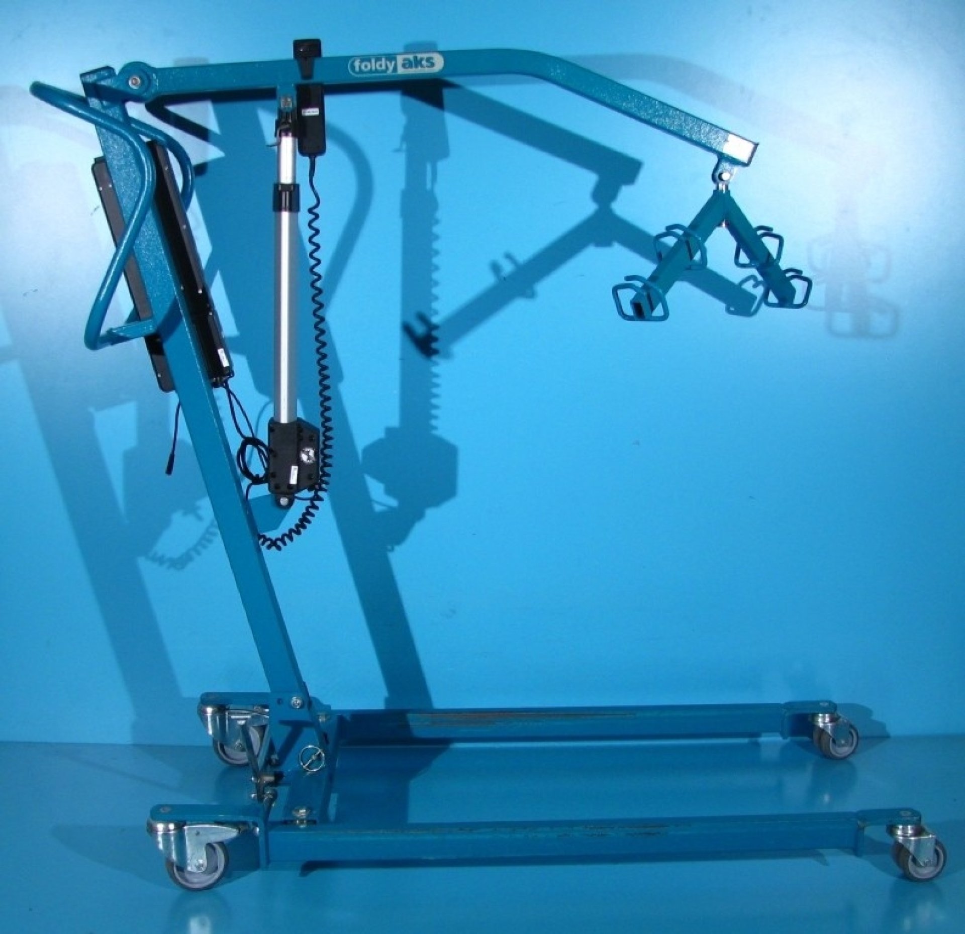 Acest lift pentru pacienti se regleaza cu ajutorul unei manete si este dotat cu 4 roti din care cele 2 din spate sunt cu sistem de franare pentru picior.