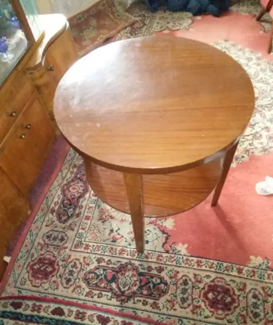 Masa diametru 65 cm inaltime 66 cm Este din lemn lacuita rezistenta Este utilizata lacul de pe fata prezinta mini zone cu uzura platforma de jos nu prezinta urme de uzura Nu pot oferi manipulare si transport Masa se afla in Ploiesti str Nicopole