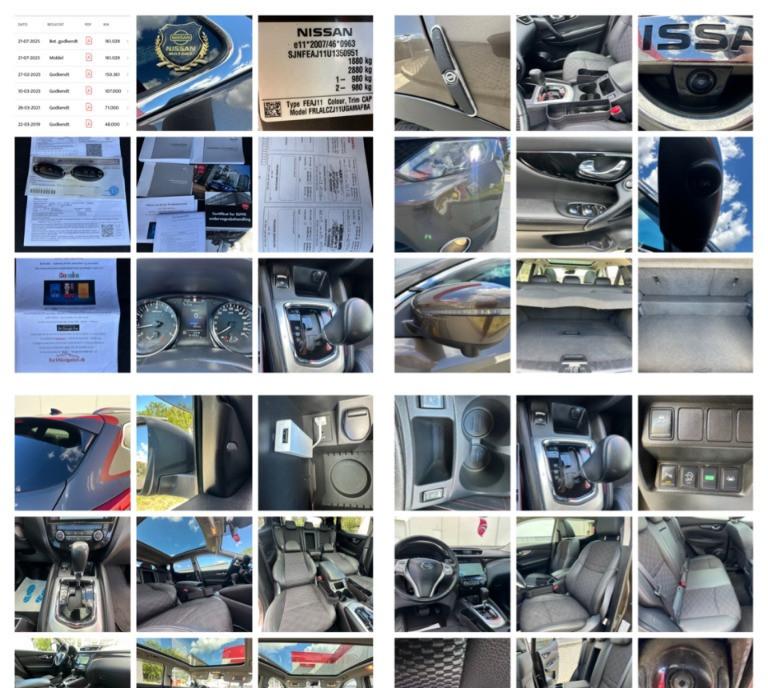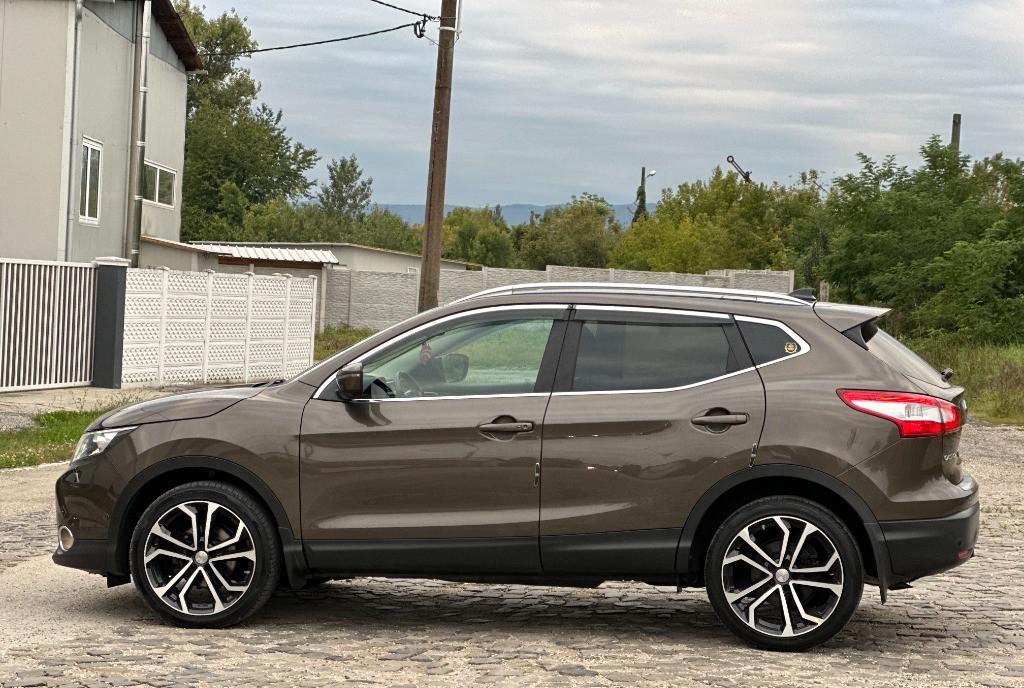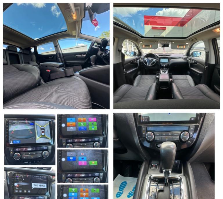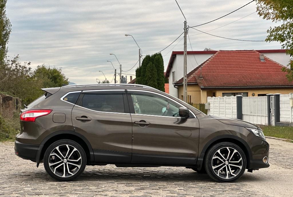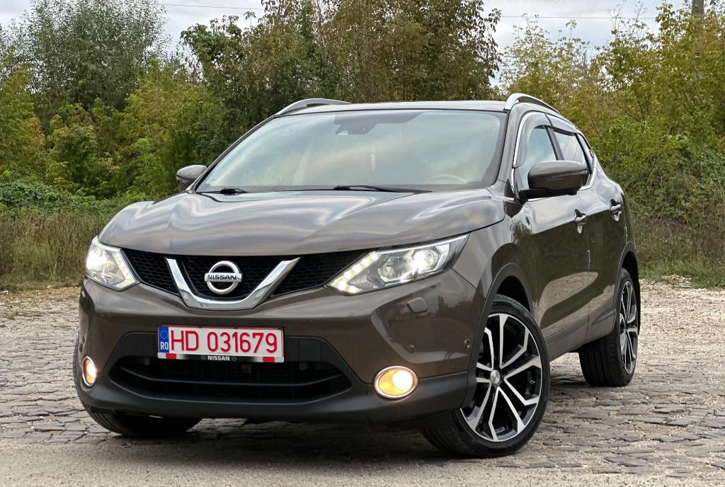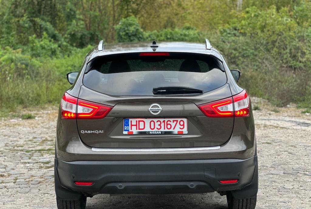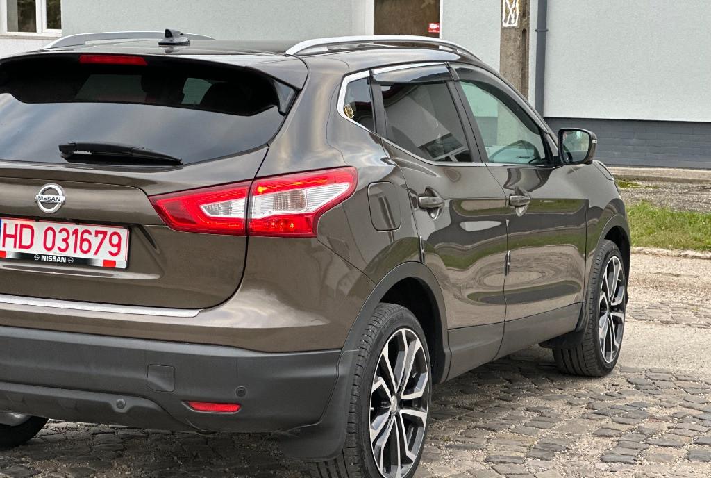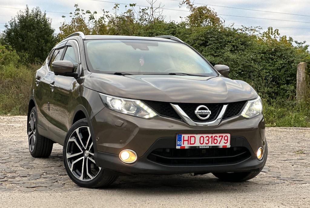 Nissan Qashqai Tekna faruri BiXenon 85 kw - 116 cp camere 360 pe oglinzi grila si portbagaj panoramic actionat electric 1 2 benzina DIG-T 2WD scaune banchete piele textil cu zero uzura km 161 029 camera video marsarier af 2015/luna 04 navigatie mare color 3D cu touchscreen harti Eu Ro