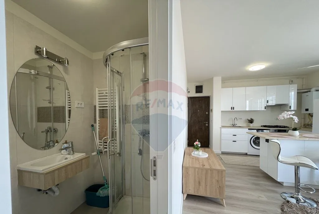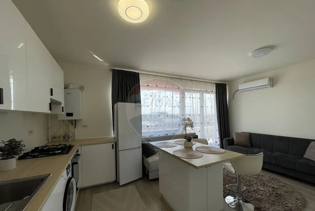 Bucătărie complet utilată open space, 2 bai, mobilat modern.