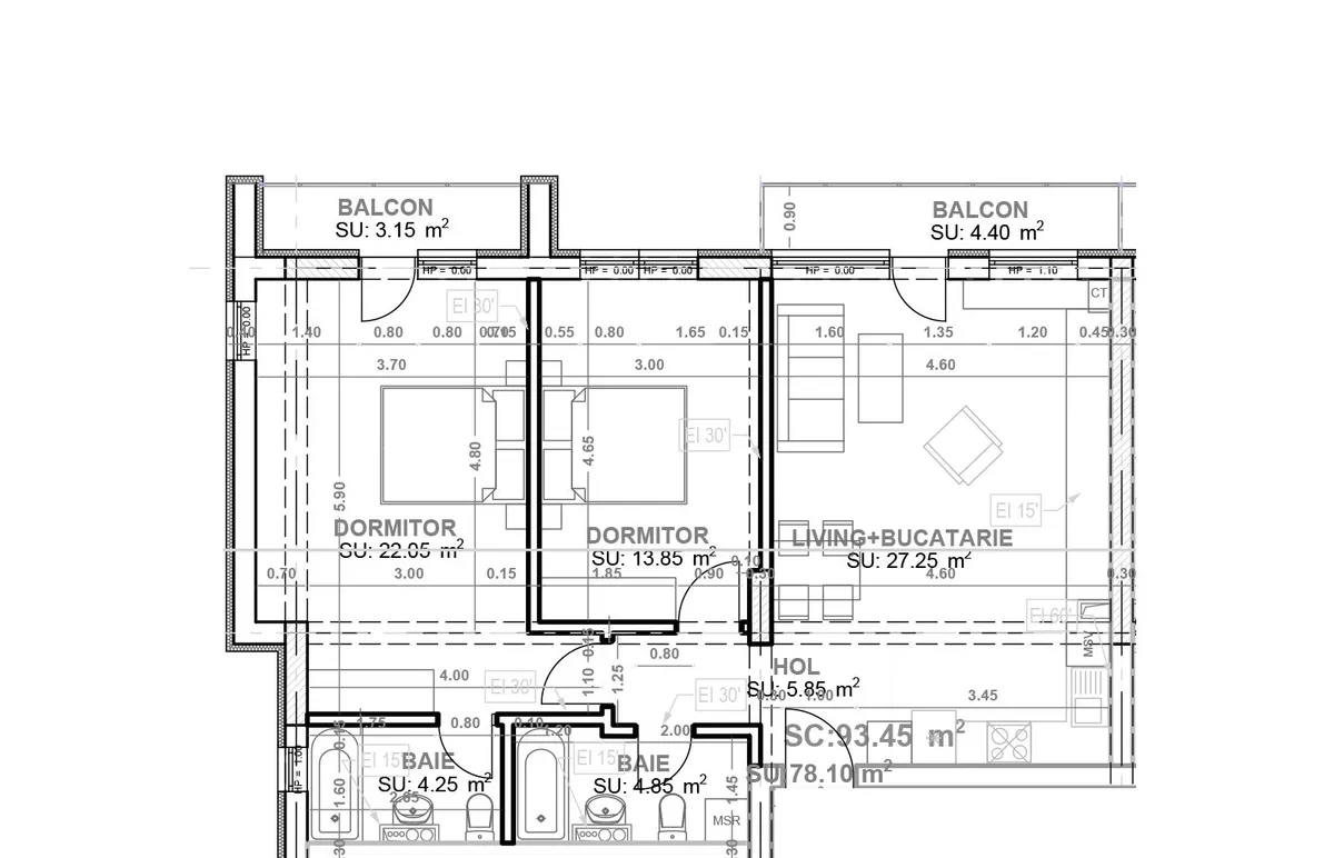 Compartimentarea apartamentelor se face astfel: