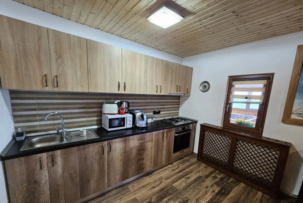 Pe lângă terasele care asigură priveliștea, întreaga pensiune este gândită și proiectată să utilizeze suprafețe vitrate generoase, prin care pătrunde multă lumină naturală și oferă spațiului o notă caldă și armonioasă. Întreaga pensiune este complet echipată cu mobilier, saltele, lenjerie, prosoape, elemente necesare funcționării optime a spațiului.