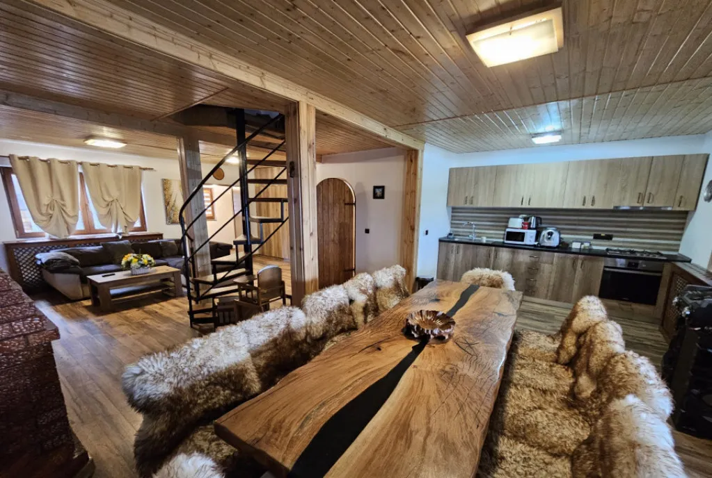 la parter se află un living cu șemineu, bucătărie deschisă, grup sanitar, saună de 8 persoane, terasă închisă în lemn amenajată pentru divertisment.