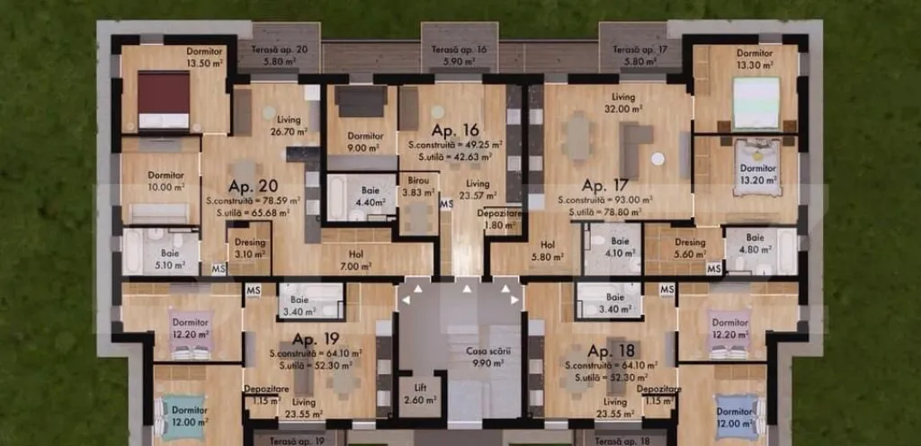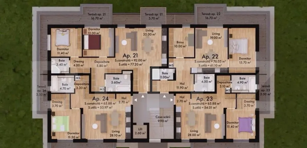 - Spații verzi și parcuri în apropiere, (peste 25% din suprafață complexului este destinata spațiilor verzi ) perfecte pentru a te bucura de natură și a petrece timp în aer liber.