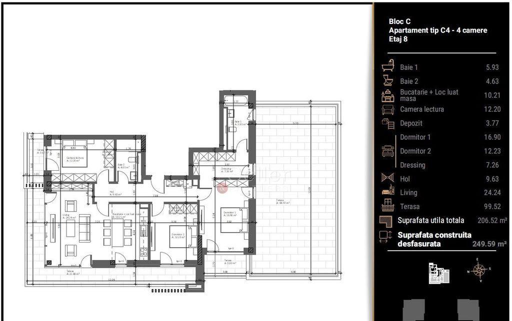 LOCALIZARE Acest imobil este situat in proiectul Cosmopolit Zenit un ansamblu rezidential modern construit cu atentie la detalii si finisaje de inalta calitate unde design-ul elegant si arhitectura contemporana se imbina perfect Proiectul se afla la intrare in Racadau in imediata apropiere a Centrului Comercial Magnolia COMPARTIMENTARE - Hol de acces care face legatura intre toate incaperile - Living-ul in care este inclusa bucataria si o zona de dining detine suprafete vitrate mari si acces catre una dintre terase - Bucataria de tip open-space - Dormitorul 1 cu dressing baie proprie si acces la terasa - Dormitoarele 2 si 3 spatioase si luminoase fiecare beneficiind de acces catre terasa - Baile una dotata cu dus cealalta cu cada ambele cu aerisire ventilata - Patru terase impreuna insumand o suprafata de 99 52 mp DOTARI - centrala termica pe intregul bloc - tamplarie PVC ferestre cu vitraj termoizolant alcatuite din 3 foi de sticla - termoizolatie exterioara cu vata bazaltica de 15 cm - usa de intrare metalica - incalzire prin pardoseala - parchet stratificat - ceramica rectificata portelanata - bai echipate PARKING Optional se poate achizitiona un loc de parcare subteran la pretul de 20 000 EURO T V A STORAGE Boxele de depozitare se achizitioneaza separat incepand cu 2 000 EURO/mp T V A FINALIZARE Complexul este in constructie termenul de finalizare pentru acest bloc fiind IUNIE 2026 IMPREJURIMI Imobilul este situat intr-o zona de blocuri accesul auto pana in zona de centru a orasului facandu-se in cca 7 minute ATRACTII ZONA Complexul va beneficia de sala de fitness cafenele restaurante si o zona verde generoasa ACCESIBILITATE Transport public in apropiere NOTA Comision 0 La pretul afisat se adauga T V A 21 Informatiile prezentate reflecta situatia reala a proprietatii fara a constitui o oferta contractuala Aceste date au fost obtinute verbal de la titularul de drept al imobilului Structura acestei prezentari nu poate fi reprodusa fara acordul scris al The Seller and Partners