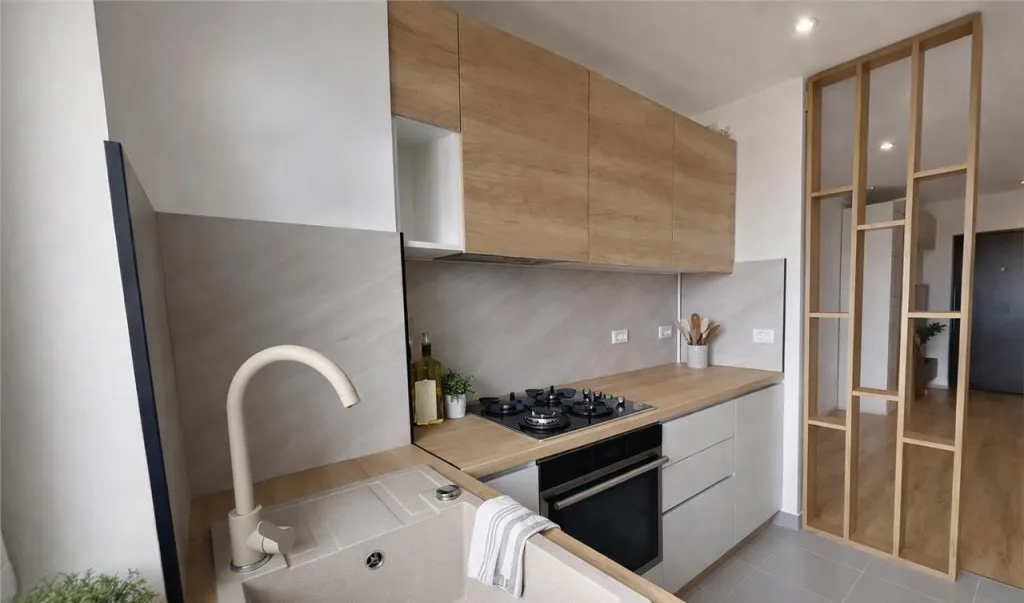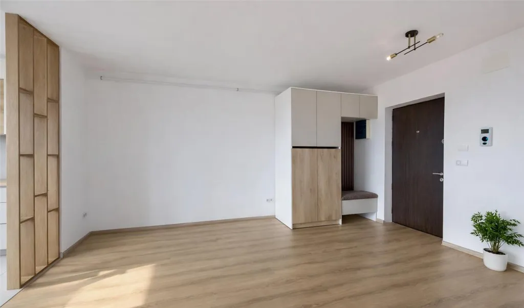 Spatiul interior este compartimentat eficient in: living open space cu bucatarie, dormitor, baie cu cada, boxa si loc de parcare. Proprietatea este semimobilata si ofera noilor chiriasi posibilitatea de personalizare.