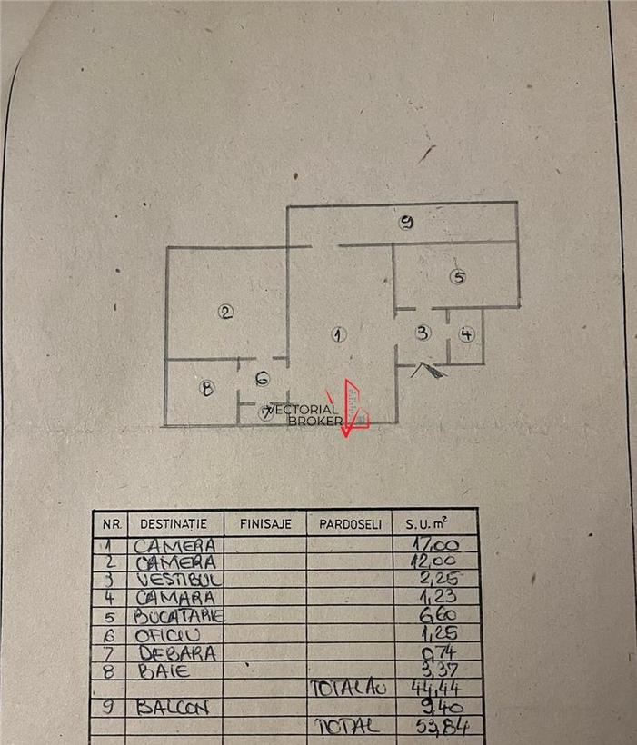 Vectorial Broker va prezinta un apartament de 2 camere in Piata Muncii reper Parc Gh Petrascu confort 1 semidecomandat avand suprafata de 54 mp cu o baie si un balcon inchis cu geam termopan pe suprafata bucatariei si a camerei de zi Locuinta este situata la etajul 6 intr-un imobil tip bloc de 9 etaje construit in anul 1963 avand 4 apartamente pe palier bloc reabilitat termic Apartamentul este imbunatatit are urmatoarele finisaje calorifere fonta ferestre PVC incalzire termoficare pereti faianta lavabil podele parchet gresie usa intrare metal instalatii electrice schimbate schimbate si coloanele de apa in bloc si este pretabil pentru locuinta Se vinde mobilat asa cum este prezentat in fotografii Recomandam aceasta proprietate persoanelor active pentru care o locuinta in apropiere de mijloacele de transport in comun statie de metrou P-ta Muncii la 10 minute de mers pe jos scoli gradinite centre comerciale supermarketuri piete agroalimentare si parcuri reprezinta un factor de decizie Pretul este usor negociabil si se accepta orice fel de creditare ID intern VB3025860