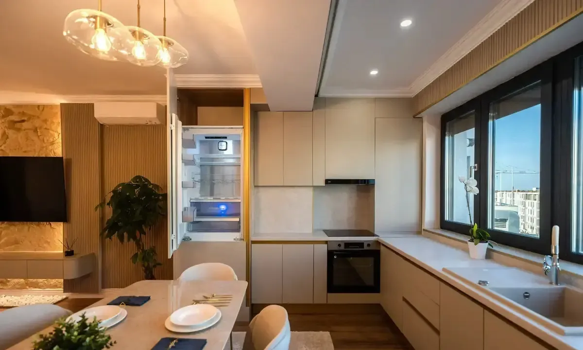 • Bucatarie si living open-space: Bucataria si livingul sunt integrate intr-un spatiu deschis, perfect pentru socializare si relaxare.