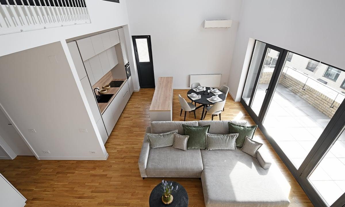 apartament 4 camere tip Penthouse vedere spectaculoasa acces in terasa generoasa de 91 mp din 2 dormitoare si living aerisire naturala in grupurile sanitare geamuri mari vitrate