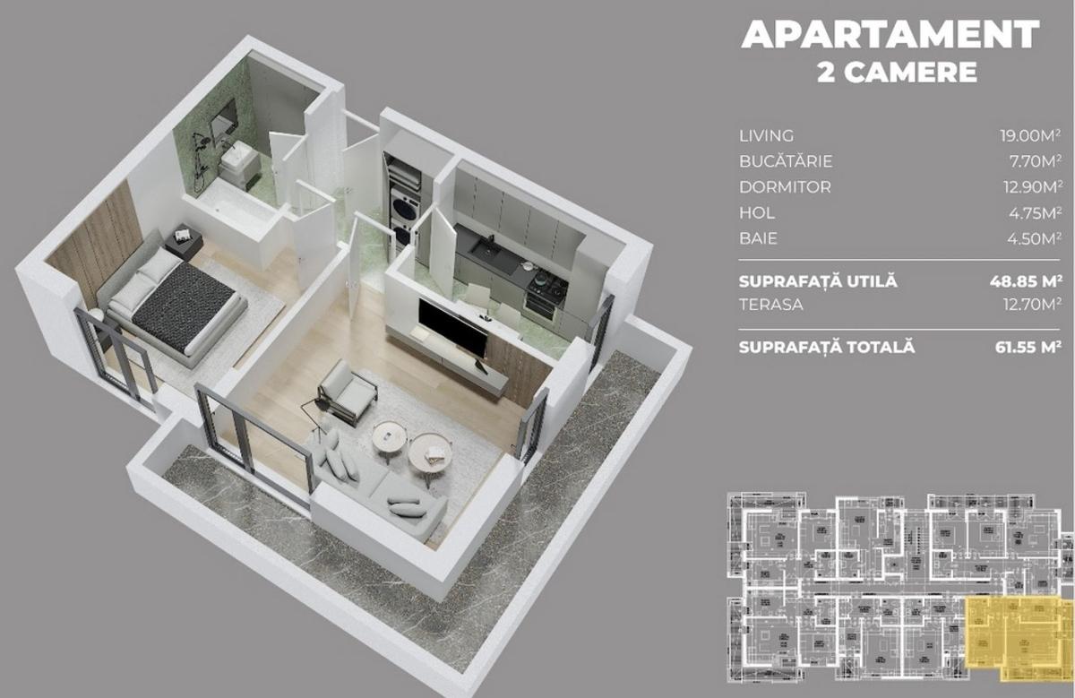 Se vinde un apartament cu personalitate situat la mansarda unui imobil modern impreuna cu un loc de parcare in subteran imobilul a fost construit in 2013 si se afla pe strada Elanului nr 14 - o zona linistita ideala pentru cei care cauta confort intimitate si o conexiune reala cu orasul Apartamentul are 2 camere fiind foarte bine compartimentat si dispune de o suprafata totala de de 54 m2 este complet mobilat si utilat modern cu mobilier nou si finisaje de calitate Apartamentul dispune de un loc de parcare in subteranul cladirii accesul facandu-se cu telecomanda Dotari suplimentare Centrala termica proprie pe gaz cu sistem de incalzire in pardoseala si contorizare individuala pentru un control complet al costurilor Loc de parcare inclus situat in subsolul cladirii Acces facil catre mijloace de transport dar ferit de agitatia orasului Ideal ca locuinta personala dar si ca investitie pe termen lung acest apartament este gata sa devina acasa pentru c...