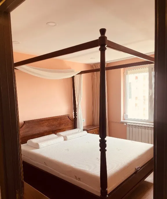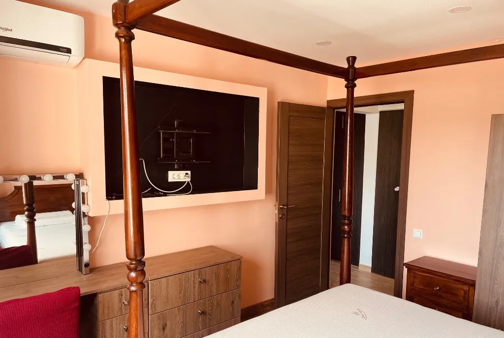 Dormitorul matrimonial este un adevărat refugiu, cu pat din lemn masiv tip baldachin și saltea ortopedică de 36 cm. Al doilea dormitor este organizat inteligent ca dressing, dar include și un pat de 120x200 cm.