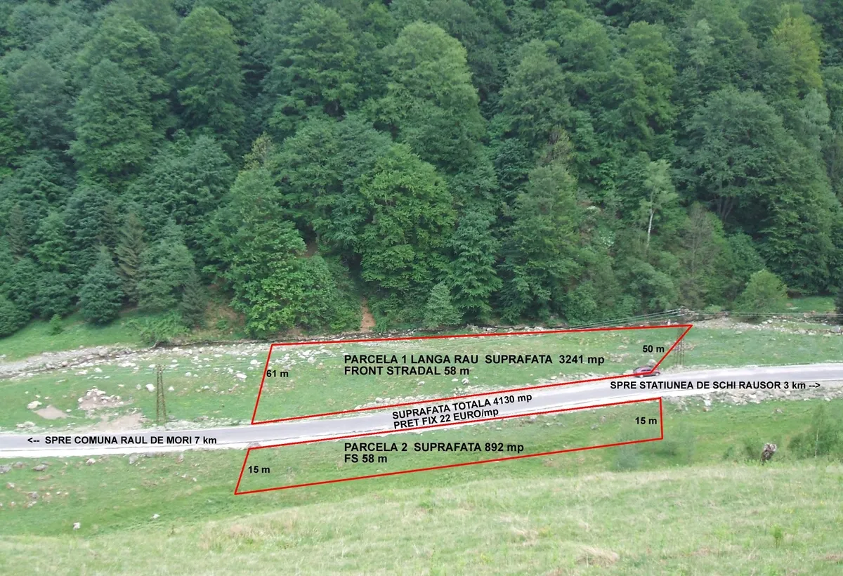 teren extravilan de 4000 mp, acces la sosea, curent electric, acces la rau, se poate construii cabana fara fundatie, pe vale sunt mai multe cabane iar la capatul soselei la 7 km este statiunea de schi Rausor. Este posibil ca la un moment dat terenurile de pe valea Rausorului sa fie facute intravilane. Zona splendida. Sunt 2 parcele care se pot vedea in poze,