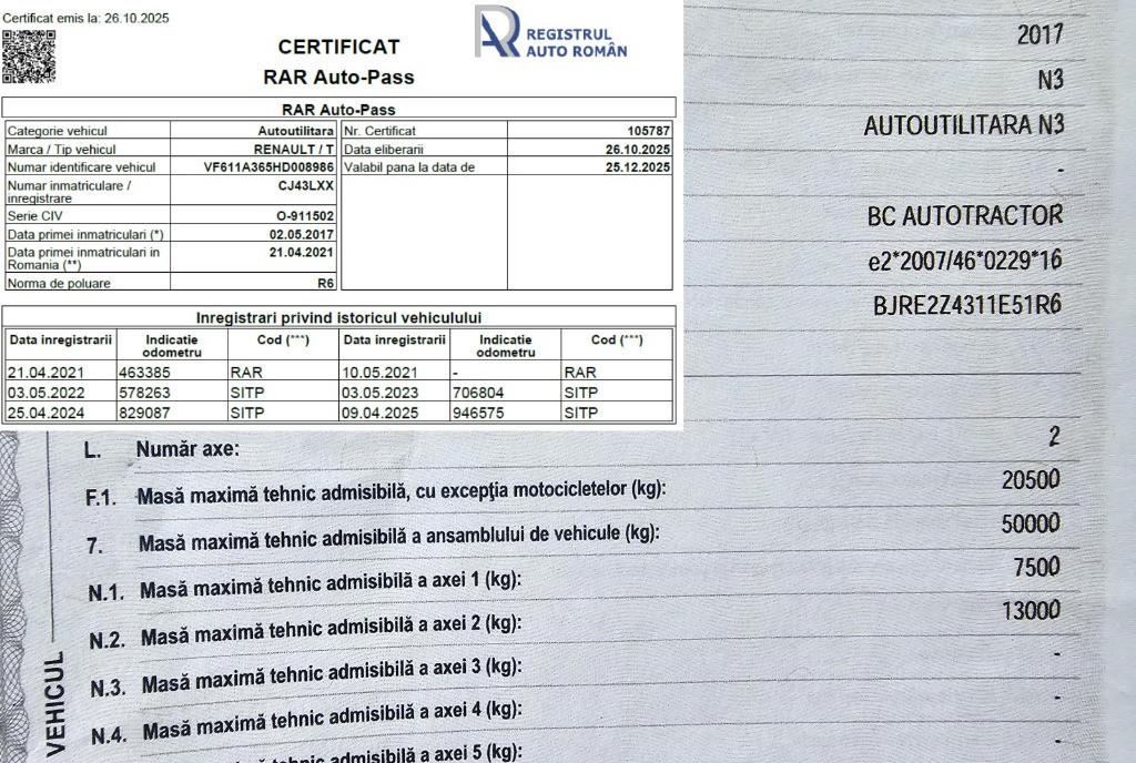 Renault T480 Motor Volvo D13K 12 777 cmc - 489 CP cutie viteze automata Volvo i-Shift Retarder 5 trepte Pret 17 900 euro NET Greutate 7456 kg Total maxim admisa in ansamblu 50 tone Cauciucuri fata GoodYear 315/70 R22 5 - Peste 50 Cauciucuri spate Bridgestone 315/70 R22 5 - Maxim 50 Tahograf ultima generatie instalat in Decembrie 2024 in Olanda calibrare valabila pana in Decembrie 2026 Achizitionat de la Volvo Romania in 2021 unic proprietar in Romania istoric Volvo - Compresor aer schimbat in garantie in 2023 - Ambreiaj Schimbat in 2024 - Frane noi - Un injector 6 pahare injectoare schimbate in Mai 2025 - Filtru particule DPF schimbat in 2024 la Volvo - Reglaj motor anual - Senzori Ad-Blue si Presiune rampa schimbati in 2024 - Perne aer cabina si sasiu schimbate in 2024 - Toate reviziile facute cu piese originale Volvo