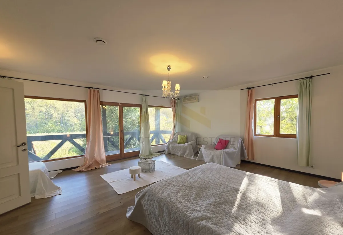 The upper floor includes five bedrooms, among which the master suite enjoys a stunning lake view directly from the bed, a private dressing room, and an en-suite bathroom with a shower and a jacuzzi. Two additional bathrooms and another balcony with panoramic garden and forest views complete the layout.