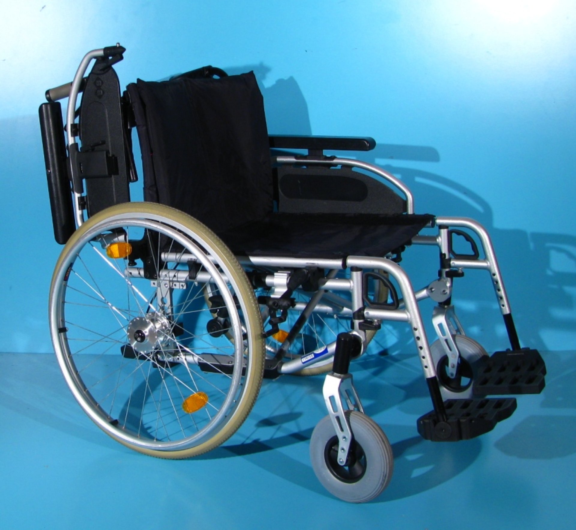 Scaunul cu rotile este dotat cu rotita antirasturnare pe partea stanga.