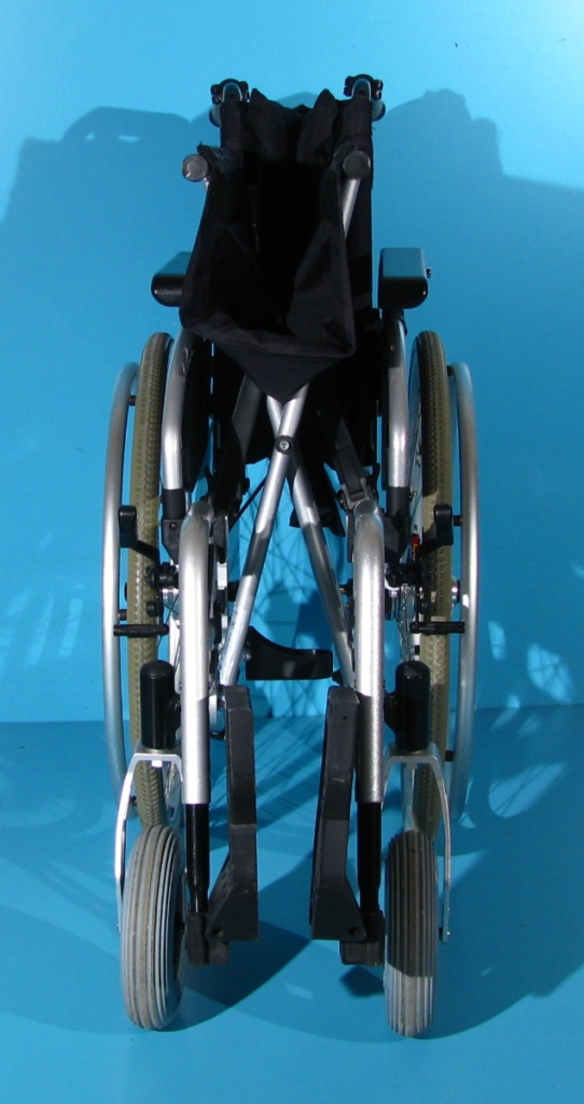 Scaunul rulant are schelet metalic si parti din aluminiu, vopsit epoxy.