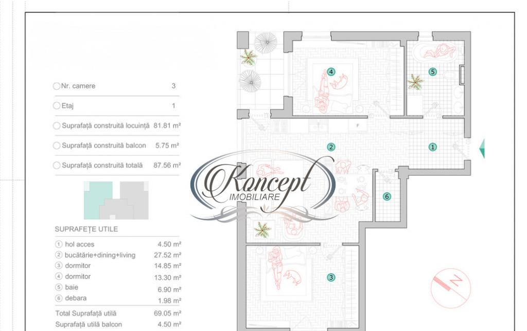 Koncept Imobiliare va ofera spre vanzare un apartament modern intr-un complex rezidential smart house de tip boutique intim format din doar doua cladiri fiecare cu cate 9 apartamente amplasat pe Strada Oasului in proximitate de CREIC Apartamentul este situat la etajul 1 al imobilului demisol destinat parcarilor apoi P 1 etaj retras intr-o zona accesibila cu conexiuni rapide spre punctele importante din oras beneficiind de orientare Sud-Vest ideala pentru lumina naturala si confort pe tot parcursul zilei Proprietatea are suprafata utila de 69 05 mp la care se adauga o logie de 4 50 mp Compartimentarea este eficienta si echilibrata hol living cu bucatarie open-space 2 dormitoare baie si un dressing dedicat un plus important pentru organizare si spatii de depozitare in interiorul apartamentului Se preda la stadiul de semifinisat cu sapa doua maini de glet si instalatiile trase pe pozitii oferind flexibilitate pentru amenajare dupa preferintele viitorului proprie...