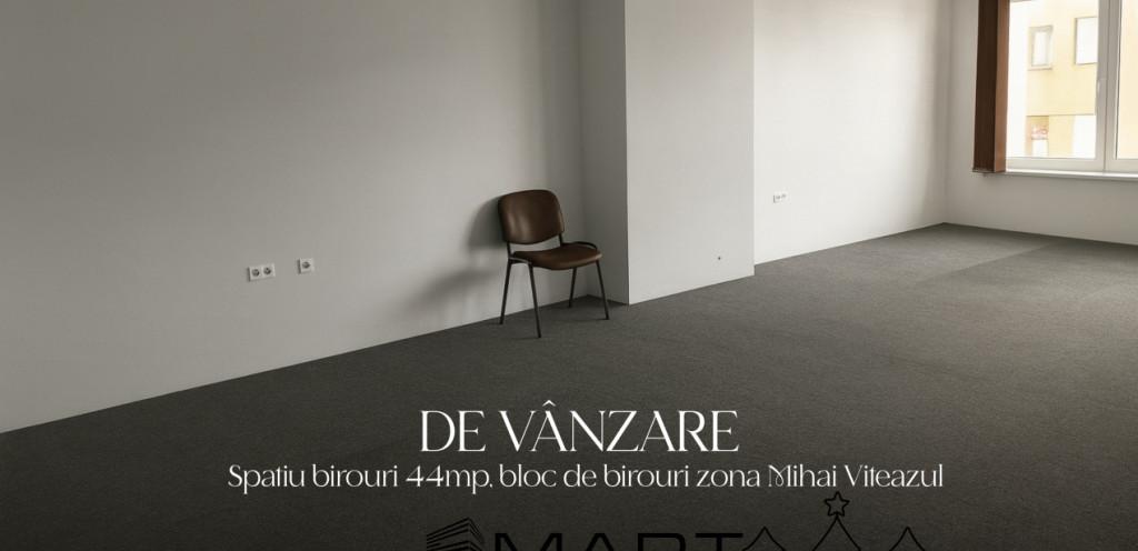 Smart Imobiliare propune la vanzare spatiu pentru birouri in zona Mihai Viteazu Spatiul este situat intr-o cladire de birouri la etajul 1/5 accesul se poate face pe scari si cu liftul Suprafata utila este de 45 mp este o singura camera luminoasa cu geamuri de termopan vitrina avand aprox 5 m liniari si podeaua este acoperita cu granit si mocheta Spatiul are acces la toaletele din holul cladirii acestea fiind la comun In apropiere sunt cabinete notariale Camera de comert magazine statii de autobuz/taxi Precizati la telefon ca ati vazut oferta cu ID P18204 Pretul de promovare este de 69 000EUR /negociabil in functie de conditiile stabilite impreuna cu proprietarul Pentru mai multe detalii despre aceasta proprietate si pentru programarea unei vizionari va rugam sa contactati consultantul responsabil Smart Imobiliare va ofera consultanta completa pe tot parcursul tranzactiei de la prima vizita si pana la predarea cheilor Id intern P18204