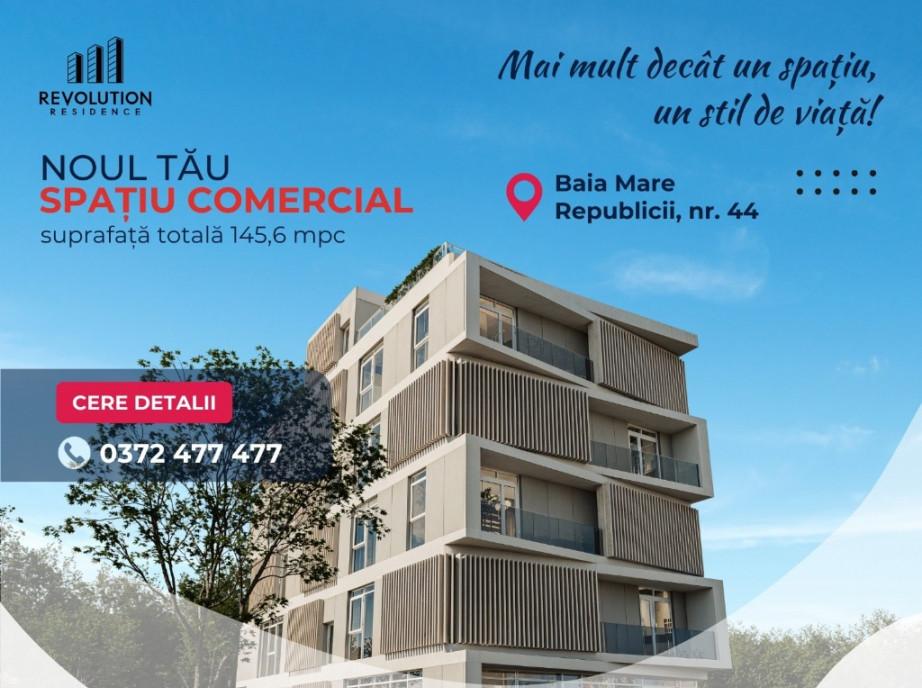 Complex Rezidential REVOLUTION VISTA PREMIUM situat in zona Catedralei Sfanta Treime pe Bdul Republicii 44 din Baia Mare va propune spre achizitie un spatiu comercial administrativ sau de birouri Se ofera spre vanzare spatiu comercial situat intr-un complex rezidential pe Bulevardul Republicii nr 44 intr-o zona cu trafic pietonal si auto intens -Suprafata spatiu 129 05 mpc -Terasa aferenta 16 55 mpc -Suprafata totala 145 6 mpc -Acces direct din exterior -Vizibilitate foarte buna Spatiul este ideal pentru magazin cabinet medical/stomatologic salon de infrumusetare birouri showroom cafenea sau alte activitati comerciale Avantaje -amplasare excelenta intr-o zona rezidentiala populata -suprafata generoasa usor compartimentabila -terasa proprie -zona in continua dezvoltare cu potential ridicat Pret 2100 Euro mpc TVA care se va aplica conform normelor in vigoare Pentru mai multe detalii ne puteti contacta la numarul de telefon 0372 477 477 0774 049 796