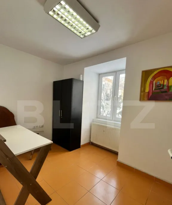 Spațiul este compartimentat în 3 încăperi, dispune de baie și chicinetă, fiind ideal pentru activități de birou, cabinet, firmă de servicii etc.