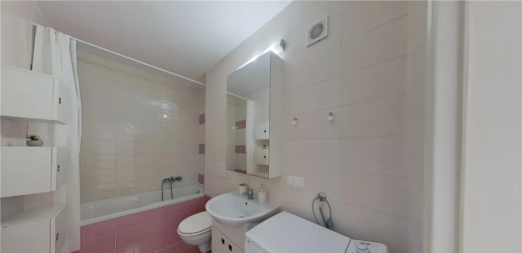 Baie spatioase dotata cu cada cu panel de dus bideu ,vas toaleta si bazin incastrat ,oglinda cu dulap suspendat ,