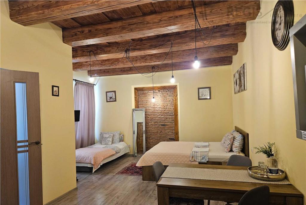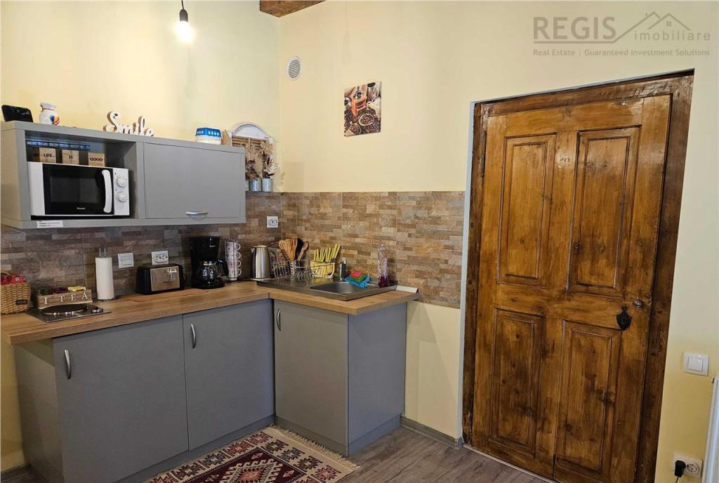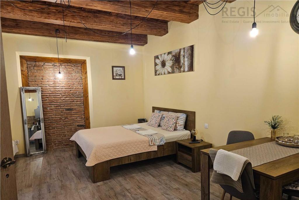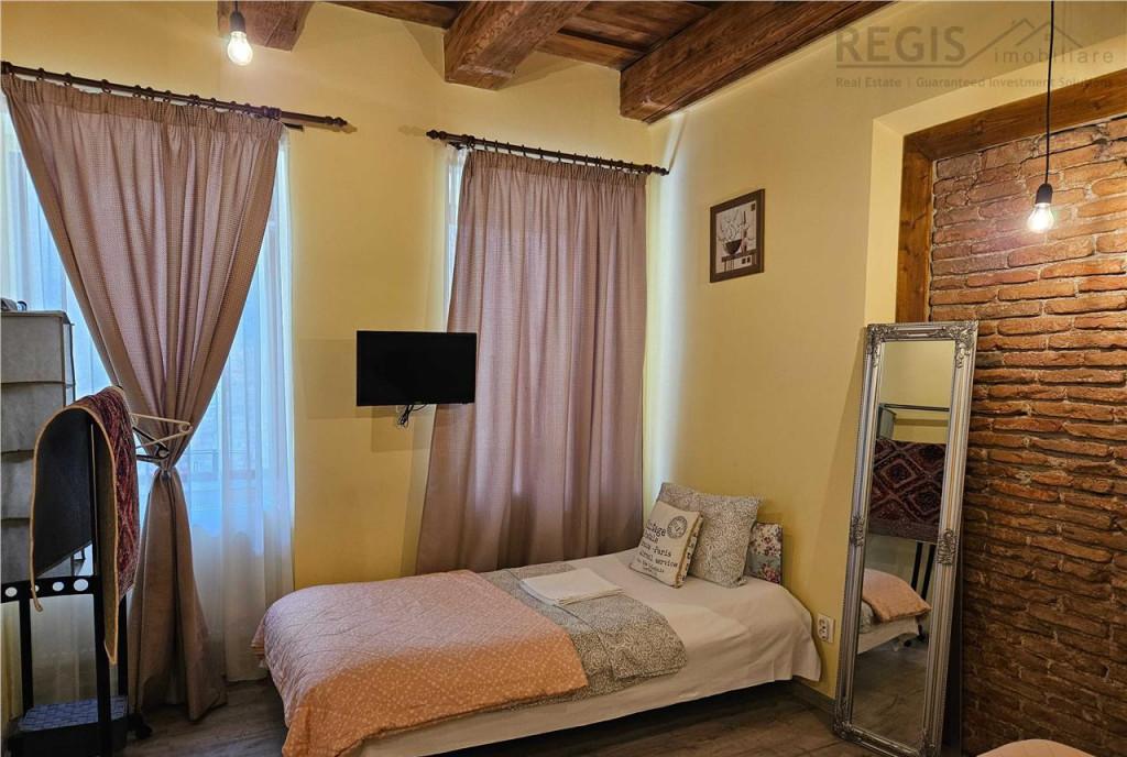 ID intern 6462 Regis Imobiliare va propune spre vanzare un studio situat in Centrul Istoric al Brasovului pe strada Michael Weiss la doar 70 m de Piata Sfatului Proprietatea este recent renovata complet atat la interior cat si la exterior fatada imobilului si se vinde mobilata fiind gata pentru locuit sau exploatare in regim hotelier/Airbnb Studio-ul este amplasat intr-o constructie solida din caramida cu barne autentice din lemn masiv care pastreaza farmecul specific zonei istorice Compartimentare - camera - bucatarie - baie - hol - debara / spatiu de depozitare aprox 5 mp - pivnita pentru depozitare - acces la mansarda comuna spatiu de depozitare Alte avantaje - centrala termica proprie pe gaz - contor individual de apa - iesire directa din proprietate in curtea interioara - proprietate pretabila atat pentru locuinta cat si pentru investitie Airbnb Comision agentie 2 TVA