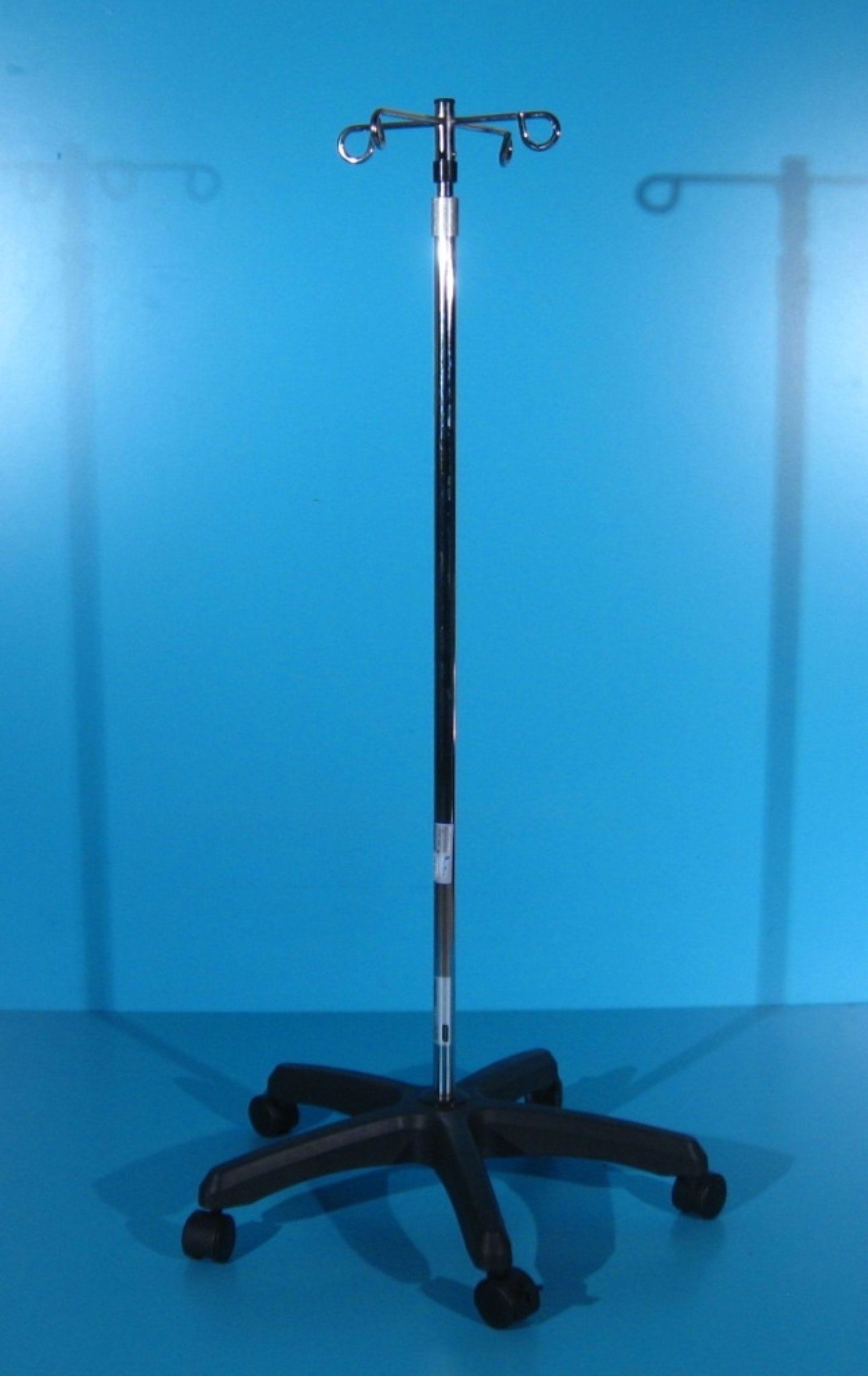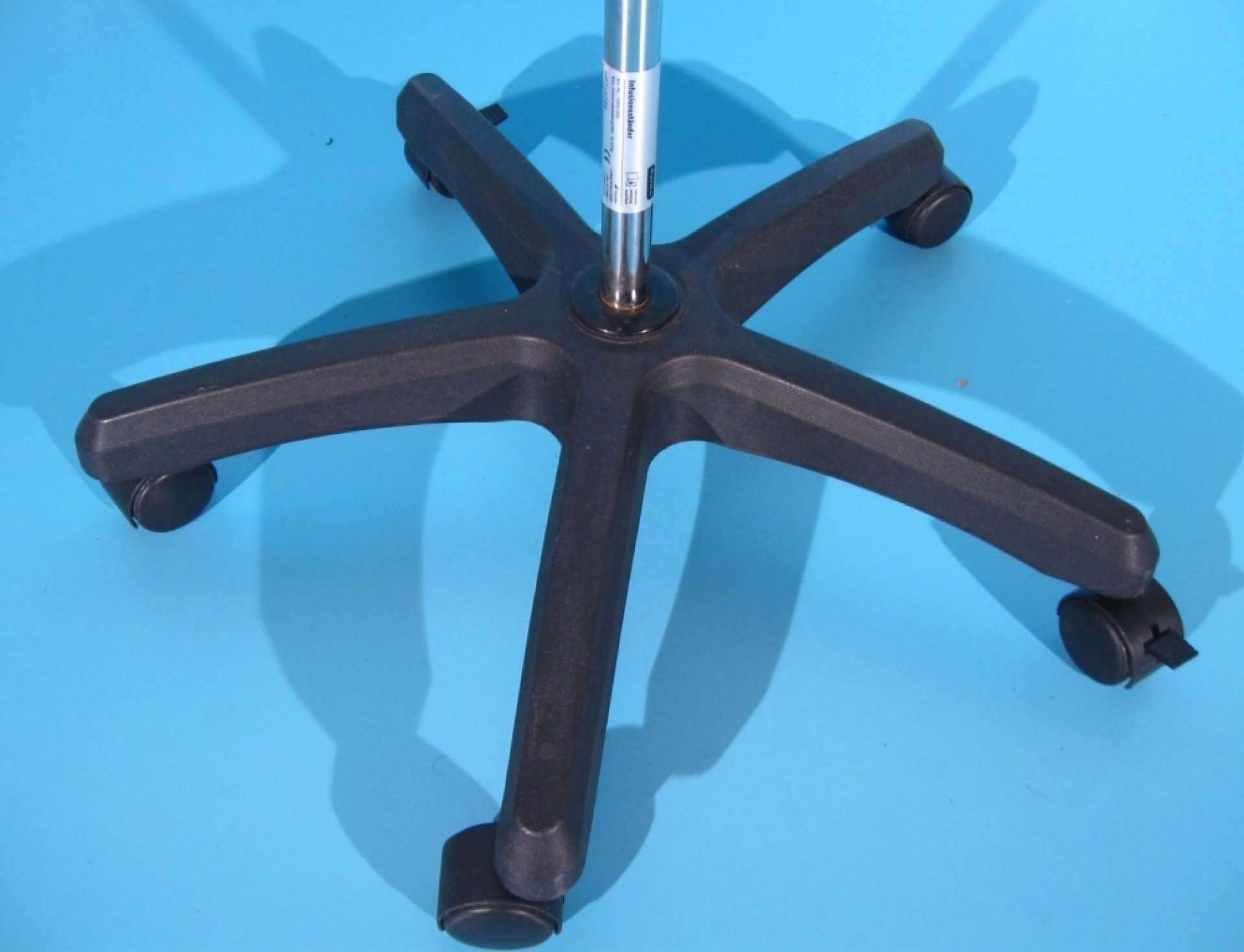 Suport pentru perfuzie cu baza tip stea cu 5 brate si 5 role de plastic pivotante, dintre care 2 au sistem de franare.