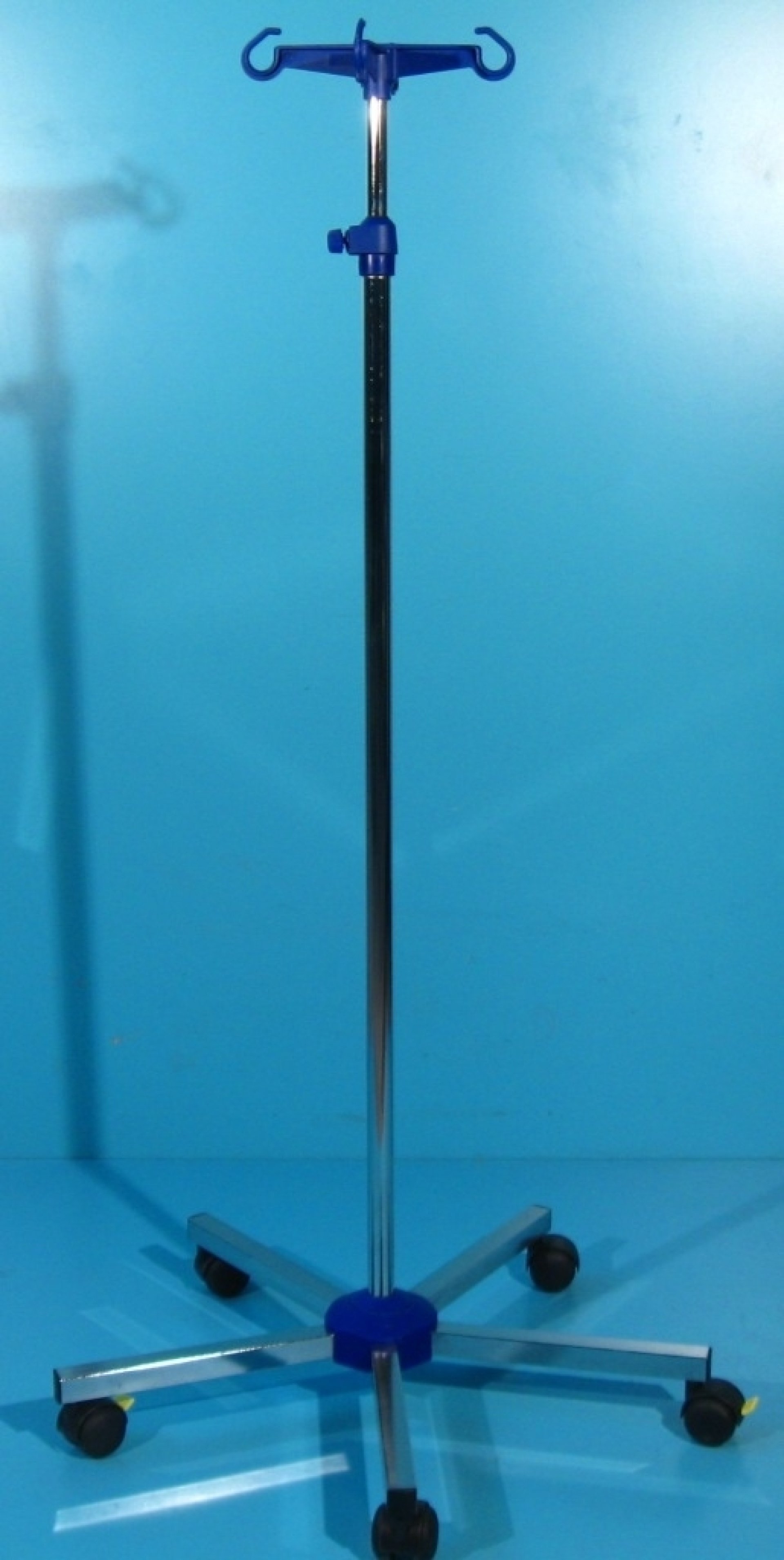 Suport pentru perfuzie din inox cu baza tip stea cu 5 brate si 5 role de plastic pivotante, dintre care 2 au sistem de franare.