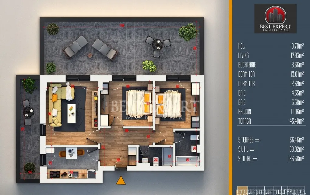 Suprafata utila - 68.92 mp utili +56.46 mp balcon, total 125.38 mp utili