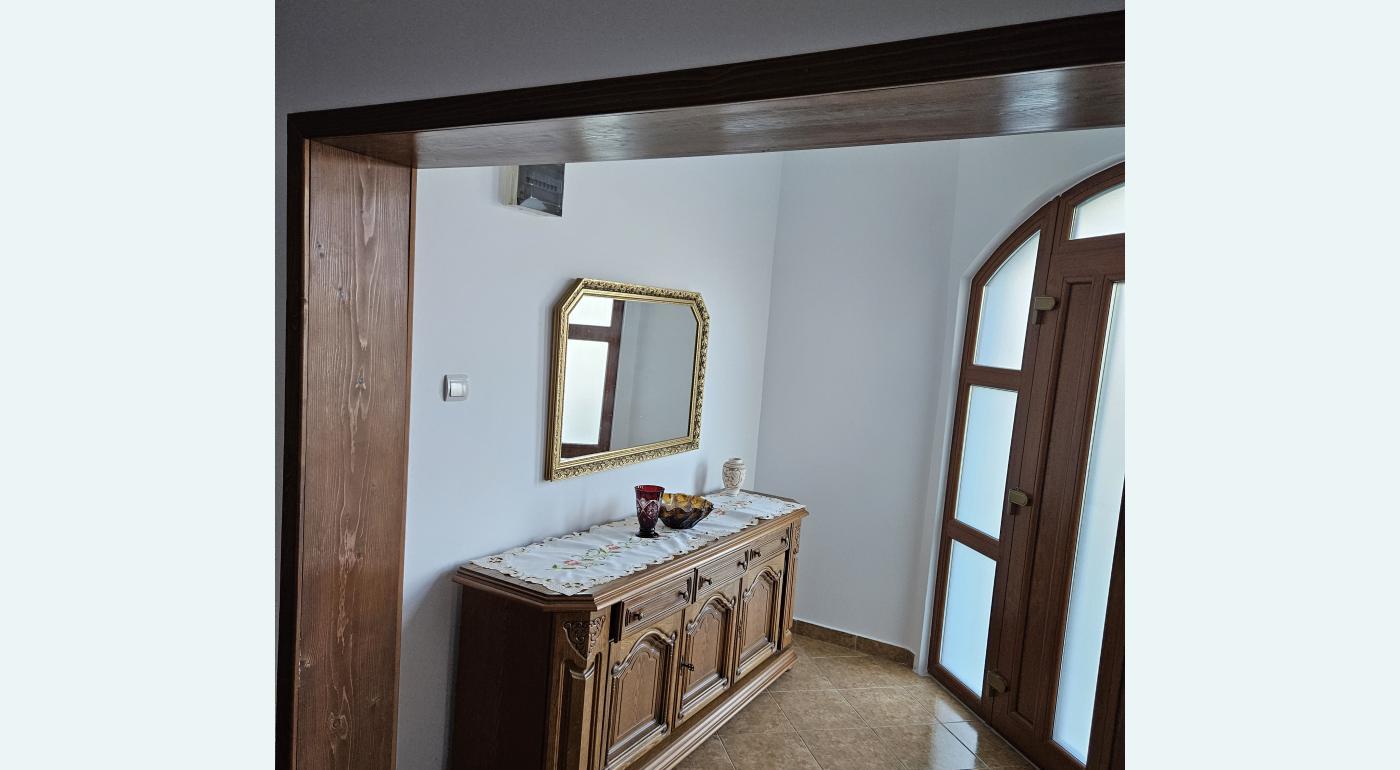 Casa este constructie 2007 compusa din 4 dormitoare living holuri baie bucatarie camara si se vinde mobilata si utilata Are amprenta de 180mp si are pod mansardat Are centrala de incalzire pe lemne Contine numeroase dependinte precum garaj si magazie lemne iar suprafata curtii este de 2900mp cu plantatii de caisi piersici ciresi pruni gutui peri si meri precum si gradina cu capsuni muri si zmeura trandafiri Actele sunt la zi