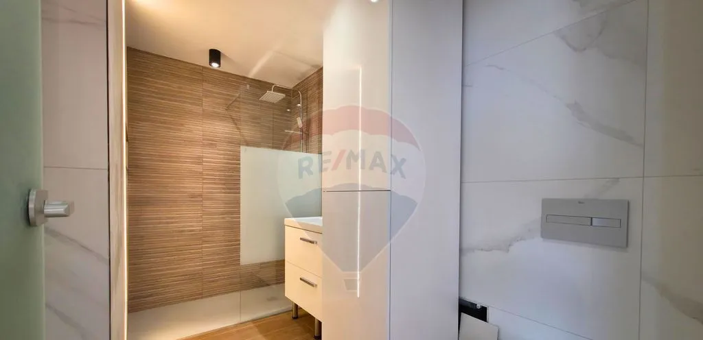 Baie elegantă cu duș walk-in și materiale de înaltă calitate