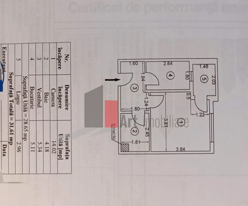 Garsoniera are suprafața utilă de 28,65mp, la care se adaugă balconul deschis de 2,96mp, rezultând astfel o suprafață totală de 31,61 mp.